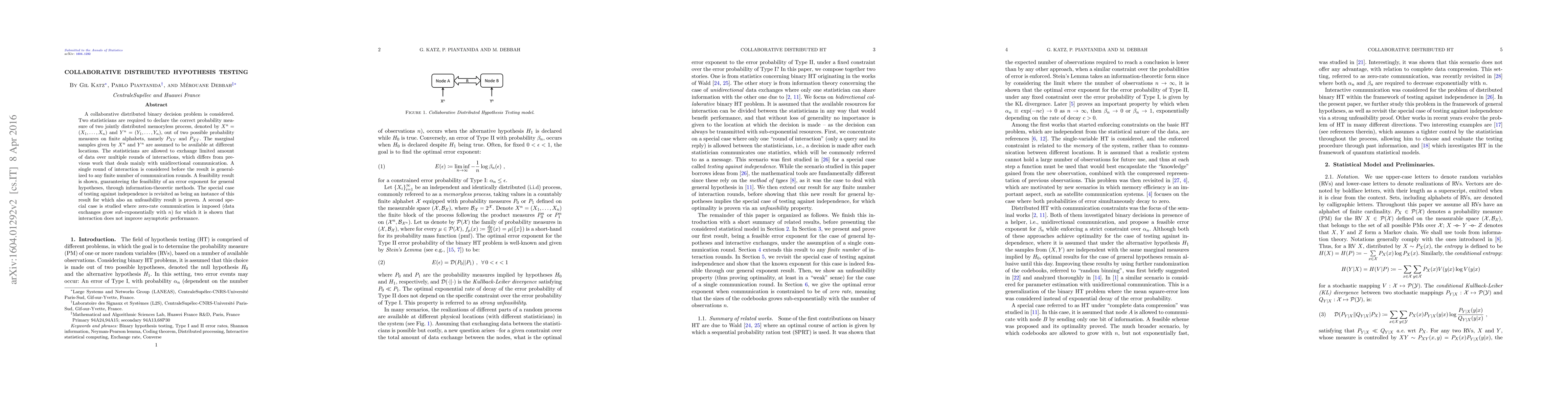This paper explores collaborative distributed binary decision testing between statisticians using limited data exchanges over multiple rounds. It demonstrates the feasibility of an error exponent for general hypotheses and shows that interaction does not improve performance under zero-rate communication constraints.