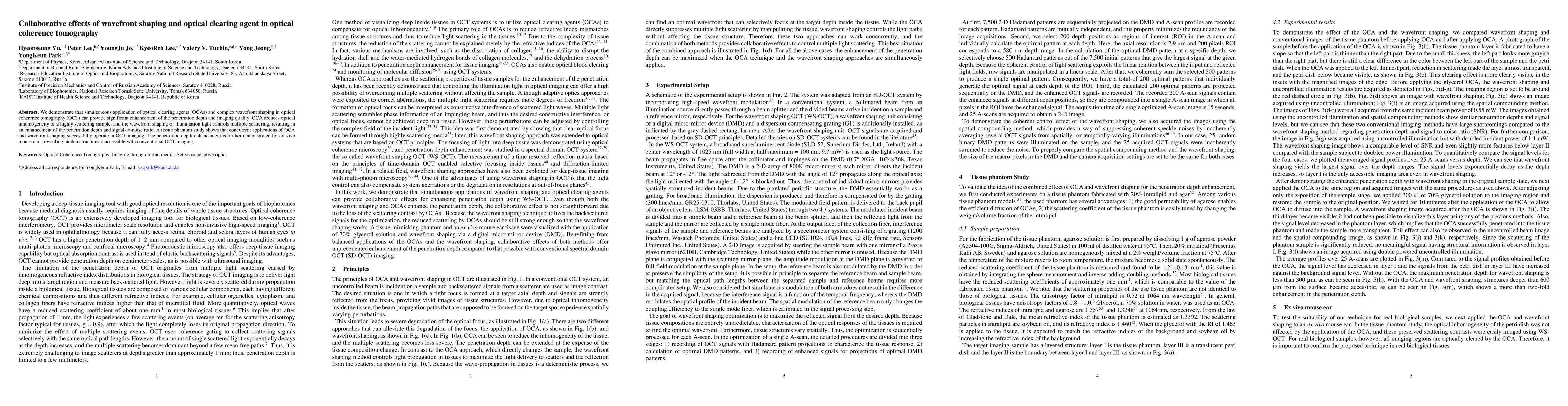 This study shows that combining optical clearing agents with wavefront shaping in optical coherence tomography significantly enhances penetration depth and imaging quality by reducing scattering and improving signal-to-noise ratio. The method successfully reveals hidden structures in ex vivo mouse ears, demonstrating its potential for improved OCT imaging.
