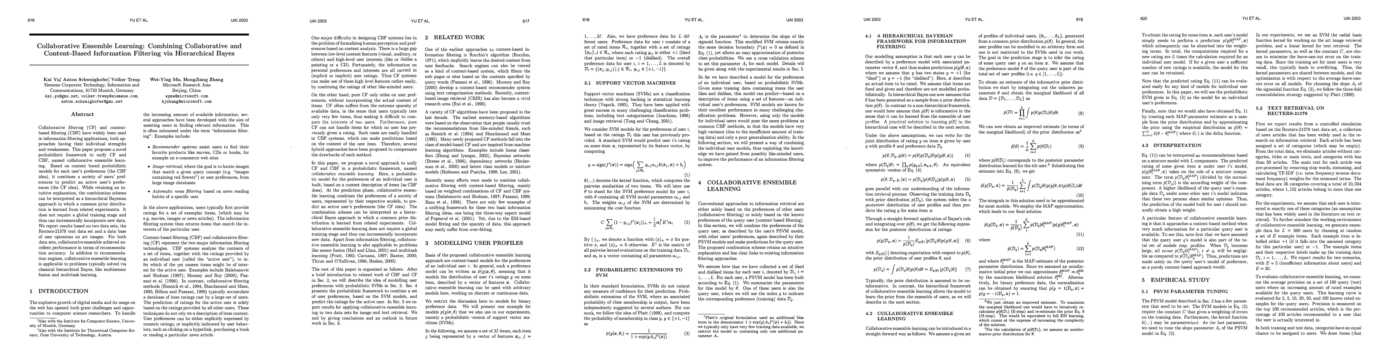 Collaborative filtering (CF) and content-based filtering (CBF) have widely been used in information filtering applications. Both approaches have their strengths and weaknesses which is why researchers have developed hybrid systems. This paper proposes a novel approach to unify CF and CBF in a probabilistic framework, named collaborative ensemble learning. It uses probabilistic SVMs to model each user's profile (as CBF does).At the prediction phase, it combines a society OF users profiles, represented by their respective SVM models, to predict an active users preferences(the CF idea).The combination scheme is embedded in a probabilistic framework and retains an intuitive explanation.Moreover, collaborative ensemble learning does not require a global training stage and thus can incrementally incorporate new data.We report results based on two data sets. For the Reuters-21578 text data set, we simulate user ratings under the assumption that each user is interested in only one category. In the second experiment, we use users' opinions on a set of 642 art images that were collected through a web-based survey. For both data sets, collaborative ensemble achieved excellent performance in terms of recommendation accuracy.