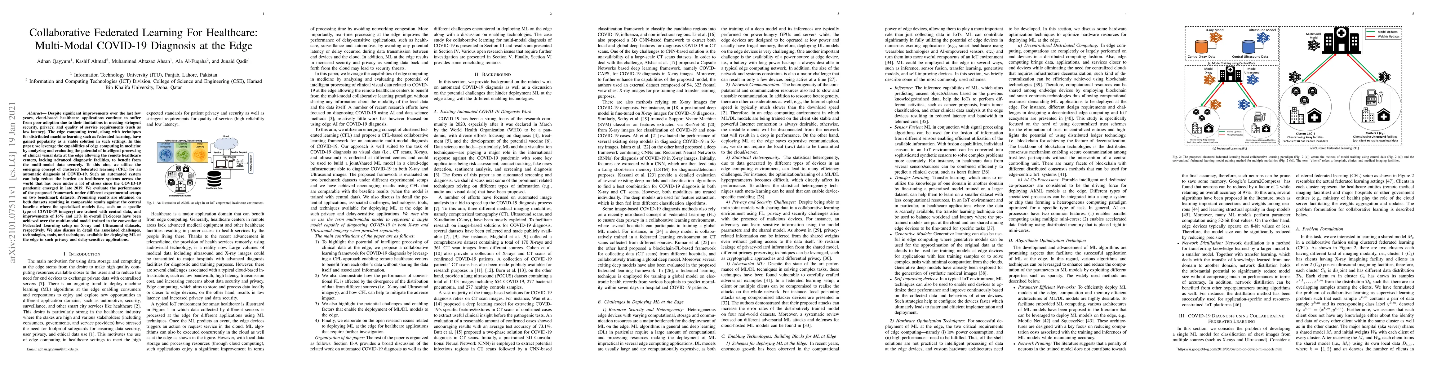 This paper explores collaborative federated learning at the edge for multi-modal COVID-19 diagnosis, utilizing clustered federated learning to enable remote healthcare centers to securely process clinical visual data. The proposed framework shows promising results, achieving improvements in F1-Scores and reducing the burden on healthcare systems.