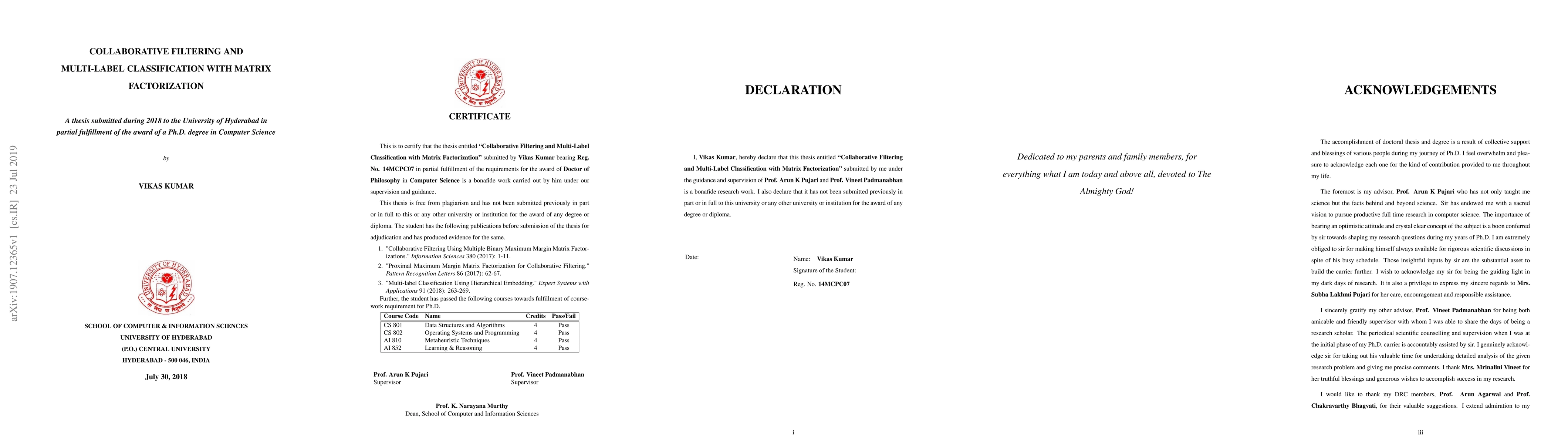 This paper proposes novel techniques for collaborative filtering and multi-label classification using matrix factorization. It introduces a hierarchical bi-level maximum margin matrix factorization for ordinal rating matrix completion and a piecewise-linear embedding method for multi-label classification with group information.