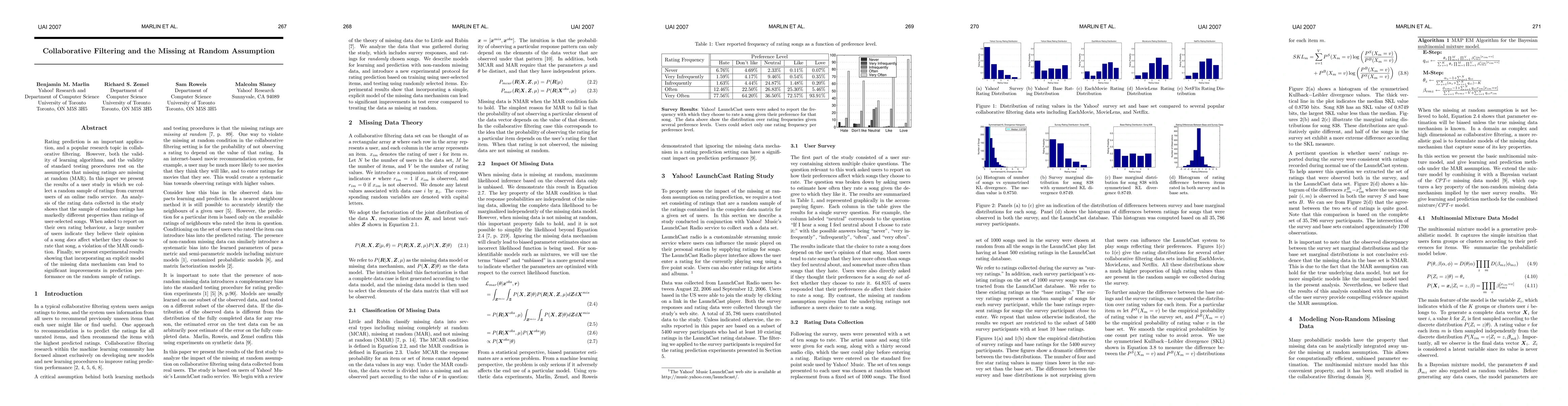 Rating prediction is an important application, and a popular research topic in collaborative filtering. However, both the validity of learning algorithms, and the validity of standard testing procedures rest on the assumption that missing ratings are missing at random (MAR). In this paper we present the results of a user study in which we collect a random sample of ratings from current users of an online radio service. An analysis of the rating data collected in the study shows that the sample of random ratings has markedly different properties than ratings of user-selected songs. When asked to report on their own rating behaviour, a large number of users indicate they believe their opinion of a song does affect whether they choose to rate that song, a violation of the MAR condition. Finally, we present experimental results showing that incorporating an explicit model of the missing data mechanism can lead to significant improvements in prediction performance on the random sample of ratings.