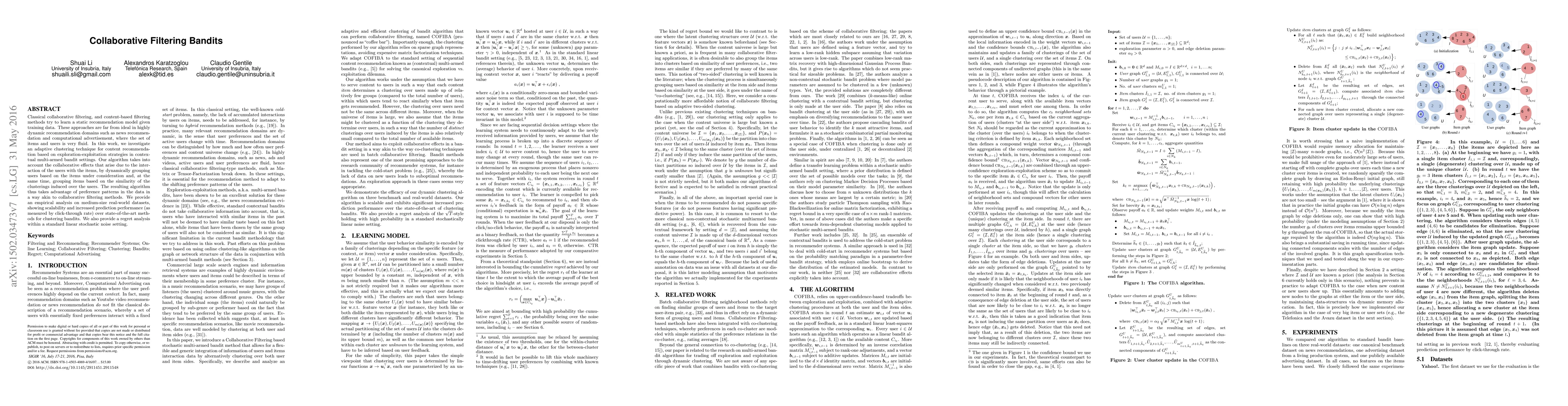 Classical collaborative filtering, and content-based filtering methods try to learn a static recommendation model given training data. These approaches are far from ideal in highly dynamic recommendation domains such as news recommendation and computational advertisement, where the set of items and users is very fluid. In this work, we investigate an adaptive clustering technique for content recommendation based on exploration-exploitation strategies in contextual multi-armed bandit settings. Our algorithm takes into account the collaborative effects that arise due to the interaction of the users with the items, by dynamically grouping users based on the items under consideration and, at the same time, grouping items based on the similarity of the clusterings induced over the users. The resulting algorithm thus takes advantage of preference patterns in the data in a way akin to collaborative filtering methods. We provide an empirical analysis on medium-size real-world datasets, showing scalability and increased prediction performance (as measured by click-through rate) over state-of-the-art methods for clustering bandits. We also provide a regret analysis within a standard linear stochastic noise setting.