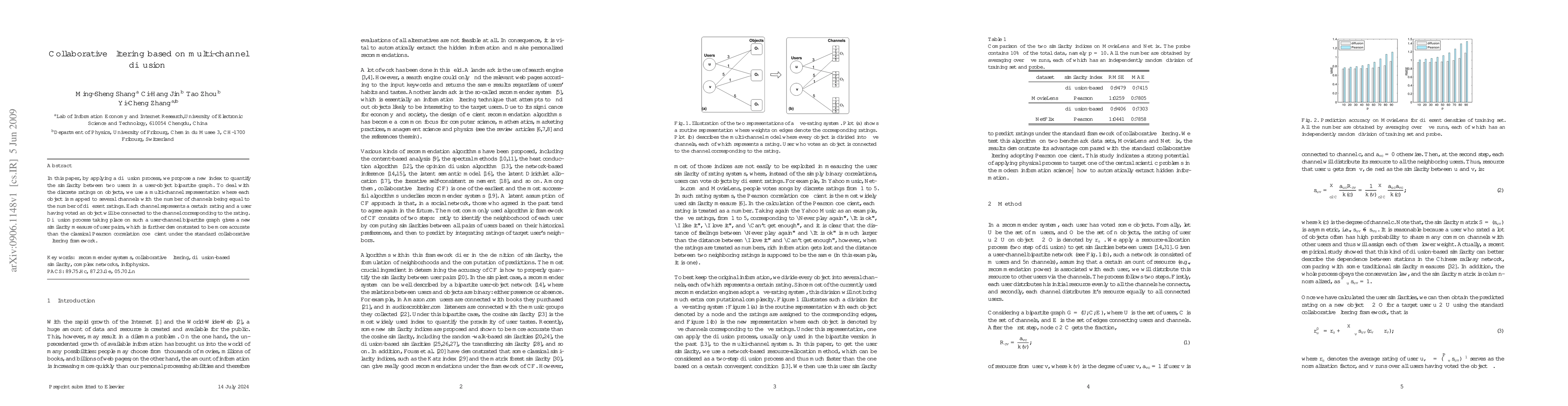 A new method for collaborative filtering is proposed, using a diffusion process on user-object bipartite graphs to create a more accurate similarity measure than traditional Pearson correlation coefficient.