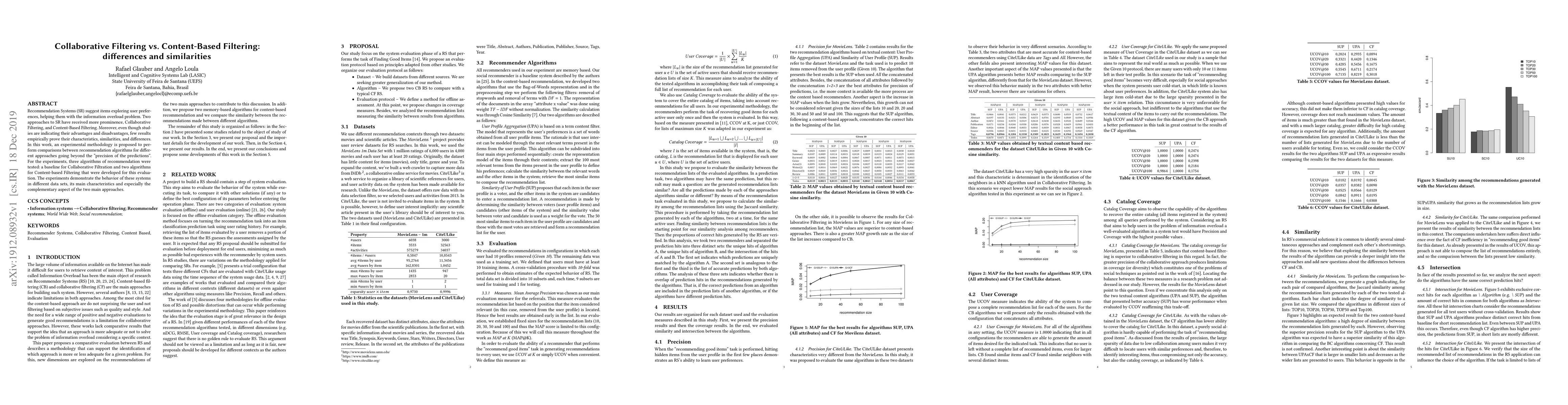 Recommendation Systems (SR) suggest items exploring user preferences, helping them with the information overload problem. Two approaches to SR have received more prominence, Collaborative Filtering, and Content-Based Filtering. Moreover, even though studies are indicating their advantages and disadvantages, few results empirically prove their characteristics, similarities, and differences. In this work, an experimental methodology is proposed to perform comparisons between recommendation algorithms for different approaches going beyond the "precision of the predictions". For the experiments, three algorithms of recommendation were tested: a baseline for Collaborative Filtration and two algorithms for Content-based Filtering that were developed for this evaluation. The experiments demonstrate the behavior of these systems in different data sets, its main characteristics and especially the complementary aspect of the two main approaches.