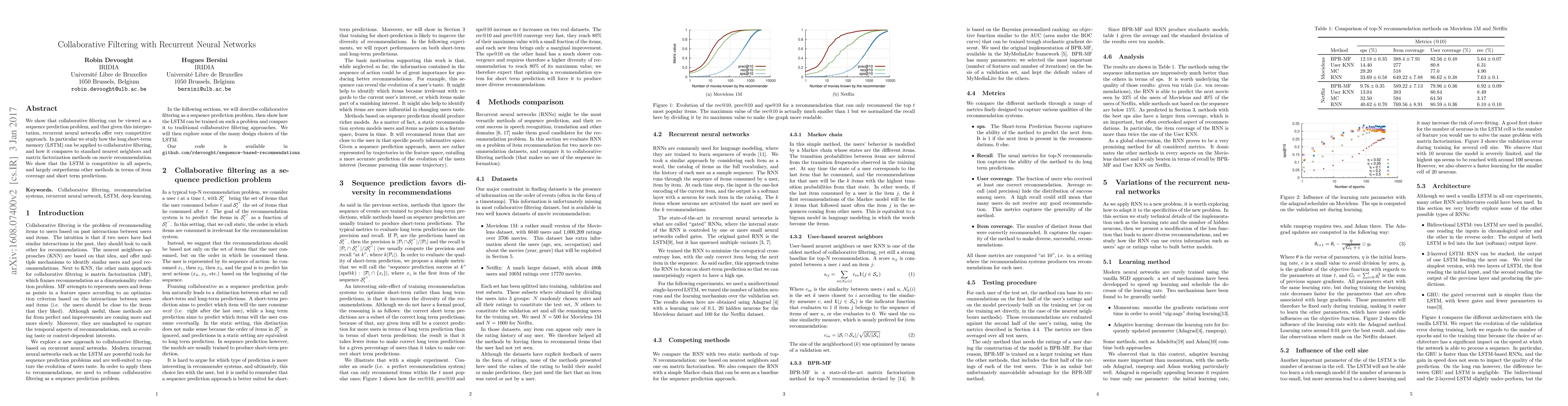 This paper explores collaborative filtering as a sequence prediction problem, demonstrating that recurrent neural networks, particularly LSTM, provide a competitive approach. The study finds that LSTM outperforms traditional methods like nearest neighbors and matrix factorization in movie recommendation tasks, especially in item coverage and short-term predictions.