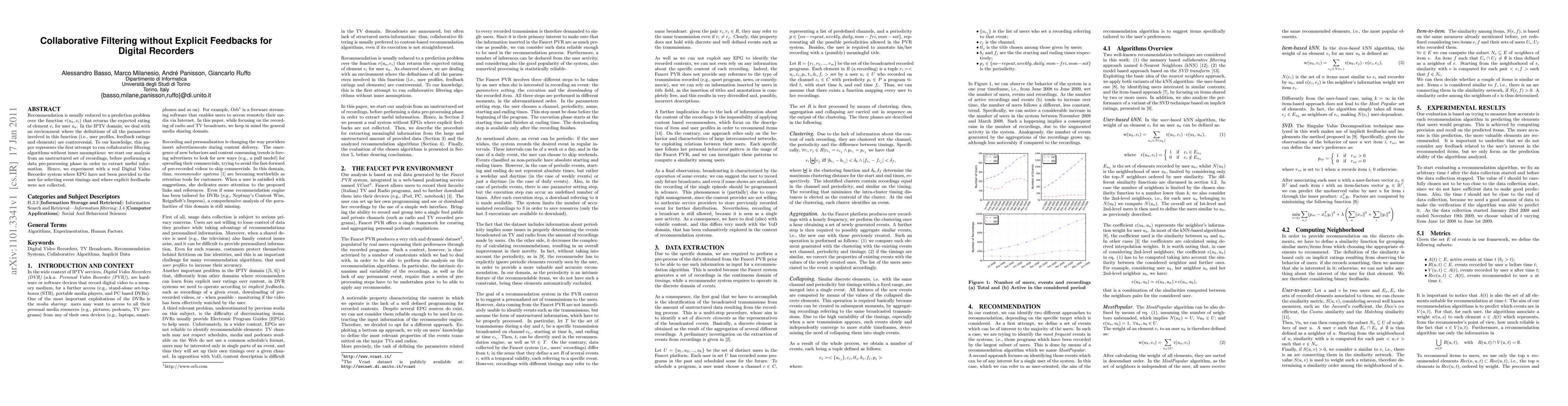 Recommendation is usually reduced to a prediction problem over the function $r(u_a, e_i)$ that returns the expected rating of element $e_i$ for user $u_a$. In the IPTV domain, we deal with an environment where the definitions of all the parameters involved in this function (i.e., user profiles, feedback ratings and elements) are controversial. To our knowledge, this paper represents the first attempt to run collaborative filtering algorithms without inner assumptions: we start our analysis from an unstructured set of recordings, before performing a data pre-processing phase in order to extract useful information. Hence, we experiment with a real Digital Video Recorder system where EPG have not been provided to the user for selecting event timings and where explicit feedbacks were not collected.