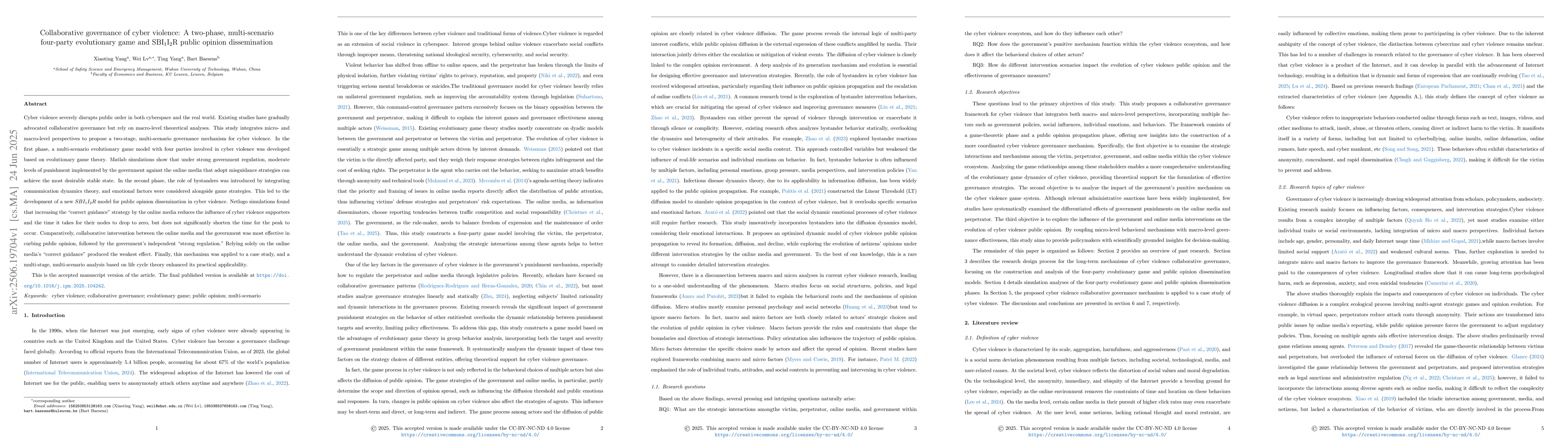 Cyber violence severely disrupts public order in both cyberspace and the real world. Existing studies have gradually advocated collaborative governance but rely on macro-level theoretical analyses. This study integrates micro- and macro-level perspectives to propose a two-stage, multi-scenario governance mechanism for cyber violence. In the first phase, a multi-scenario evolutionary game model with four parties involved in cyber violence was developed based on evolutionary game theory. Matlab simulations show that under strong government regulation, moderate levels of punishment implemented by the government against the online media that adopt misguidance strategies can achieve the most desirable stable state. In the second phase, the role of bystanders was introduced by integrating communication dynamics theory, and emotional factors were considered alongside game strategies. This led to the development of a new SBI1I2R model for public opinion dissemination in cyber violence. Netlogo simulations found that increasing the "correct guidance" strategy by the online media reduces the influence of cyber violence supporters and the time it takes for their nodes to drop to zero, but does not significantly shorten the time for the peak to occur. Comparatively, collaborative intervention between the online media and the government was most effective in curbing public opinion, followed by the government's independent "strong regulation." Relying solely on the online media's "correct guidance" produced the weakest effect. Finally, this mechanism was applied to a case study, and a multi-stage, multi-scenario analysis based on life cycle theory enhanced its practical applicability.