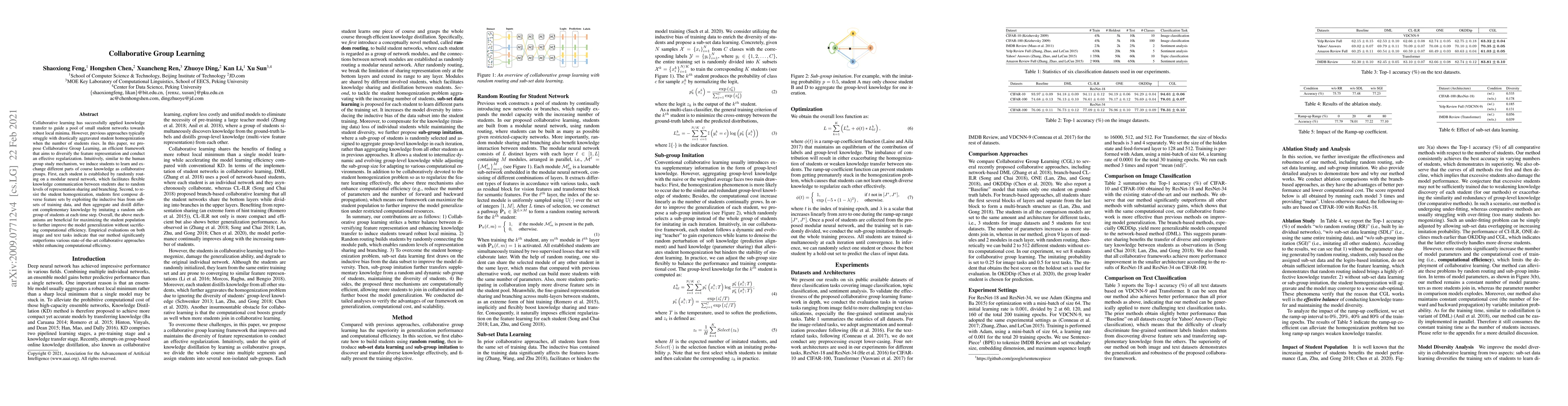 Collaborative learning has successfully applied knowledge transfer to guide a pool of small student networks towards robust local minima. However, previous approaches typically struggle with drastically aggravated student homogenization when the number of students rises. In this paper, we propose Collaborative Group Learning, an efficient framework that aims to diversify the feature representation and conduct an effective regularization. Intuitively, similar to the human group study mechanism, we induce students to learn and exchange different parts of course knowledge as collaborative groups. First, each student is established by randomly routing on a modular neural network, which facilitates flexible knowledge communication between students due to random levels of representation sharing and branching. Second, to resist the student homogenization, students first compose diverse feature sets by exploiting the inductive bias from sub-sets of training data, and then aggregate and distill different complementary knowledge by imitating a random sub-group of students at each time step. Overall, the above mechanisms are beneficial for maximizing the student population to further improve the model generalization without sacrificing computational efficiency. Empirical evaluations on both image and text tasks indicate that our method significantly outperforms various state-of-the-art collaborative approaches whilst enhancing computational efficiency.