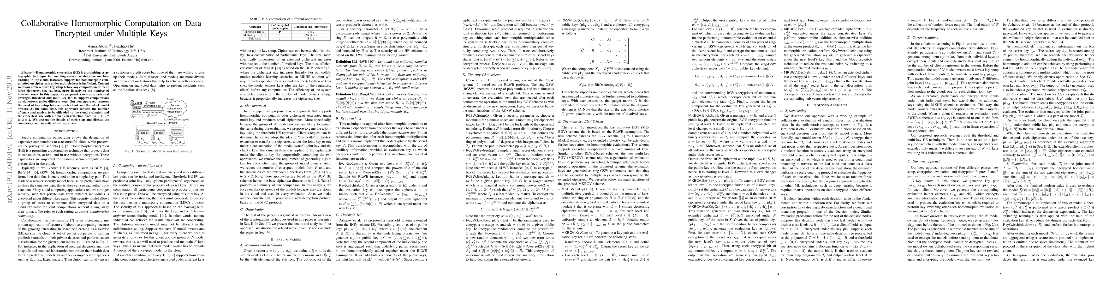 Homomorphic encryption (HE) is a promising cryptographic technique for enabling secure collaborative machine learning in the cloud. However, support for homomorphic computation on ciphertexts under multiple keys is inefficient. Current solutions often require key setup before any computation or incur large ciphertext size (at best, grow linearly to the number of involved keys). In this paper, we proposed a new approach that leverages threshold and multi-key HE to support computations on ciphertexts under different keys. Our new approach removes the need for key setup between each client and the set of model owners. At the same time, this approach reduces the number of encrypted models to be offloaded to the cloud evaluator, and the ciphertext size with a dimension reduction from (N+1)x2 to 2x2. We present the details of each step and discuss the complexity and security of our approach.