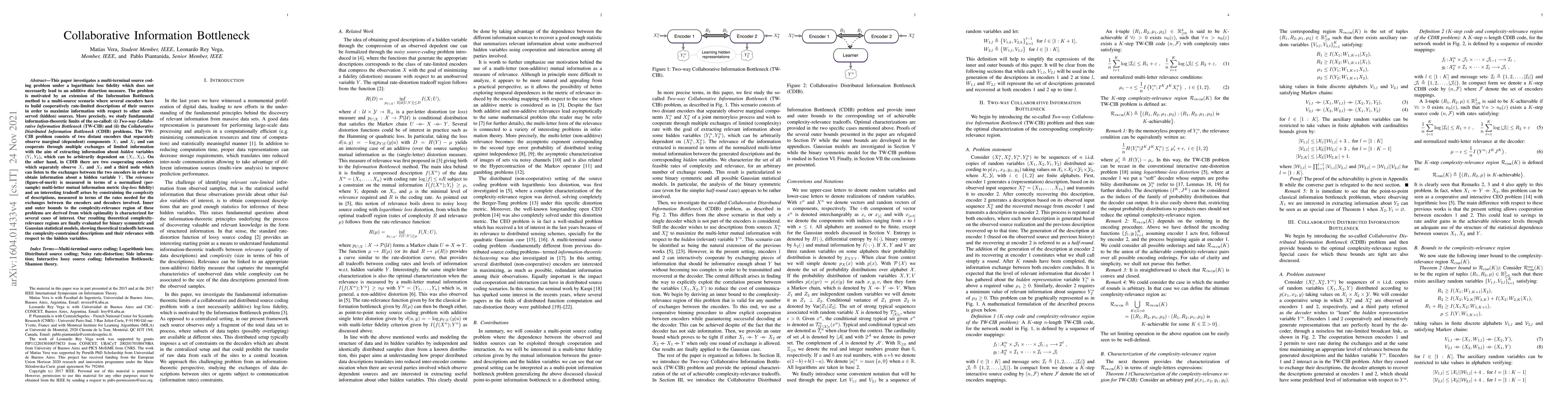 This paper investigates a multi-terminal source coding problem under a logarithmic loss fidelity which does not necessarily lead to an additive distortion measure. The problem is motivated by an extension of the Information Bottleneck method to a multi-source scenario where several encoders have to build cooperatively rate-limited descriptions of their sources in order to maximize information with respect to other unobserved (hidden) sources. More precisely, we study fundamental information-theoretic limits of the so-called: (i) Two-way Collaborative Information Bottleneck (TW-CIB) and (ii) the Collaborative Distributed Information Bottleneck (CDIB) problems. The TW-CIB problem consists of two distant encoders that separately observe marginal (dependent) components $X_1$ and $X_2$ and can cooperate through multiple exchanges of limited information with the aim of extracting information about hidden variables $(Y_1,Y_2)$, which can be arbitrarily dependent on $(X_1,X_2)$. On the other hand, in CDIB there are two cooperating encoders which separately observe $X_1$ and $X_2$ and a third node which can listen to the exchanges between the two encoders in order to obtain information about a hidden variable $Y$. The relevance (figure-of-merit) is measured in terms of a normalized (per-sample) multi-letter mutual information metric (log-loss fidelity) and an interesting tradeoff arises by constraining the complexity of descriptions, measured in terms of the rates needed for the exchanges between the encoders and decoders involved. Inner and outer bounds to the complexity-relevance region of these problems are derived from which optimality is characterized for several cases of interest. Our resulting theoretical complexity-relevance regions are finally evaluated for binary symmetric and Gaussian statistical models.