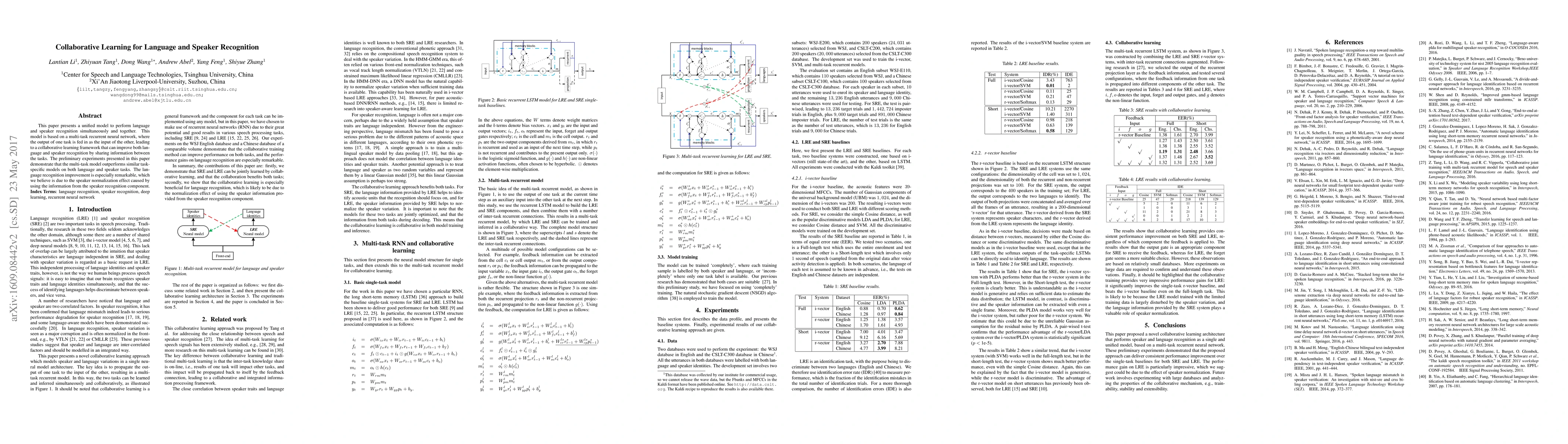 This paper introduces a multi-task recurrent neural network for simultaneous language and speaker recognition, showing improved performance through collaborative learning. Experiments reveal that the unified model outperforms separate models for both tasks.