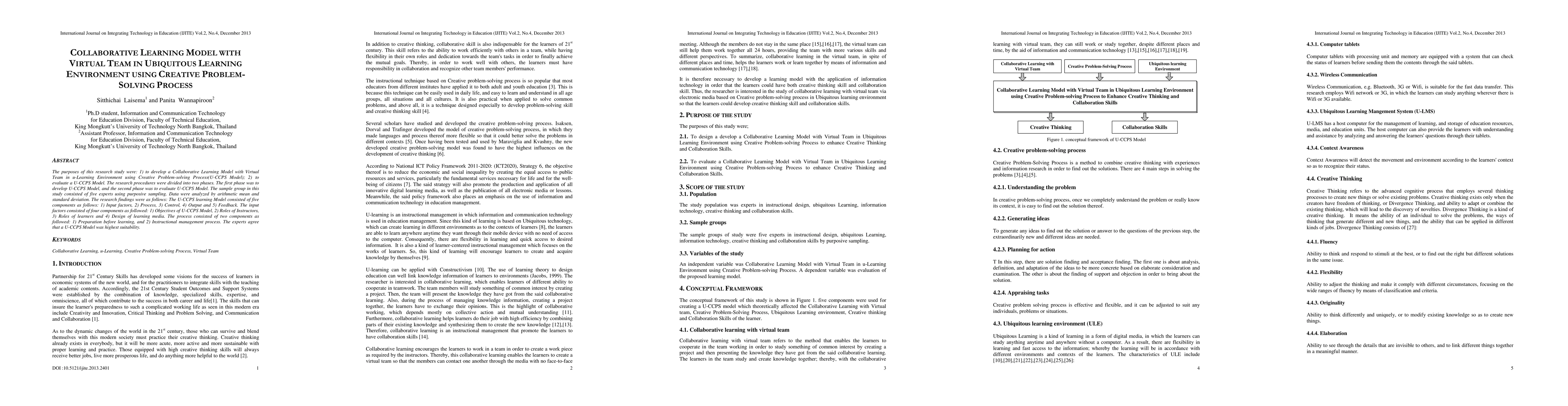 The purposes of this research study were: 1) to develop a Collaborative Learning Model with Virtual Team in u-Learning Environment using Creative Problem-solving Process(U-CCPS Model); 2) to evaluate a U-CCPS Model. The research procedures were divided into two phases. The first phase was to develop U-CCPS Model, and the second phase was to evaluate U-CCPS Model. The sample group in this study consisted of five experts using purposive sampling. Data were analyzed by arithmetic mean and standard deviation. The research findings were as follows: The U-CCPS learning Model consisted of five components as follows: 1) Input factors, 2) Process, 3) Control, 4) Output and 5) Feedback. The input factors consisted of four components as followed: 1) Objectives of U-CCPS Model, 2) Roles of Instructors, 3) Roles of learners and 4) Design of learning media. The process consisted of two components as followed: 1) Preparation before learning, and 2) Instructional management process. The experts agree that a U-CCPS Model was highest suitability.