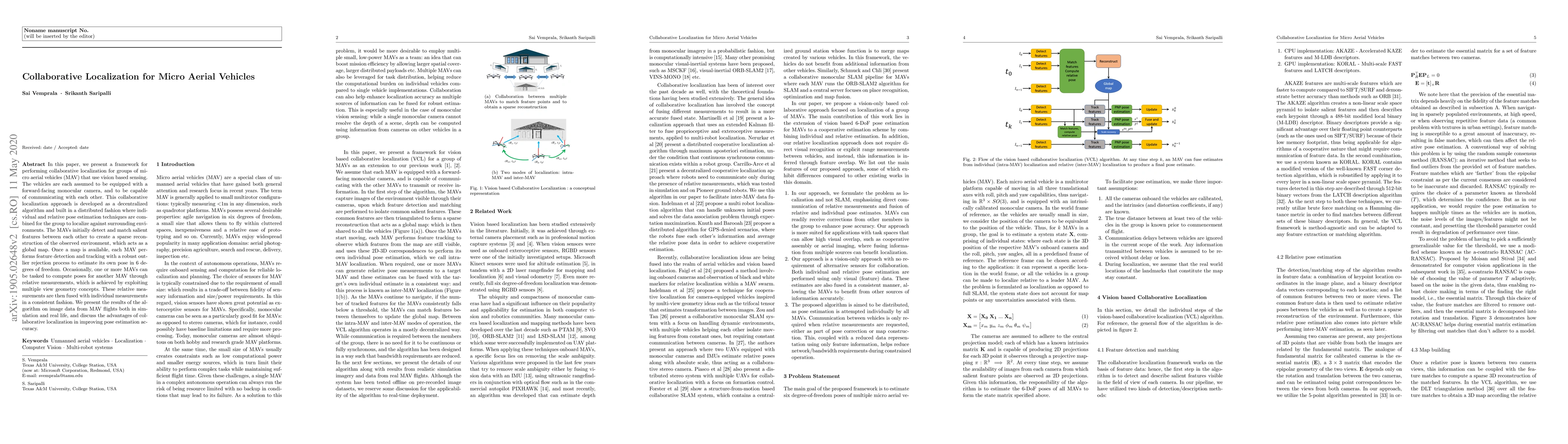 In this paper, we present a framework for performing collaborative localization for groups of micro aerial vehicles (MAV) that use vision based sensing. The vehicles are each assumed to be equipped with a forward-facing monocular camera, and to be capable of communicating with each other. This collaborative localization approach is developed as a decentralized algorithm and built in a distributed fashion where individual and relative pose estimation techniques are combined for the group to localize against surrounding environments. The MAVs initially detect and match salient features between each other to create a sparse reconstruction of the observed environment, which acts as a global map. Once a map is available, each MAV performs feature detection and tracking with a robust outlier rejection process to estimate its own pose in 6 degrees of freedom. Occasionally, one or more MAVs can be tasked to compute poses for another MAV through relative measurements, which is achieved by exploiting multiple view geometry concepts. These relative measurements are then fused with individual measurements in a consistent fashion. We present the results of the algorithm on image data from MAV flights both in simulation and real life, and discuss the advantages of collaborative localization in improving pose estimation accuracy.