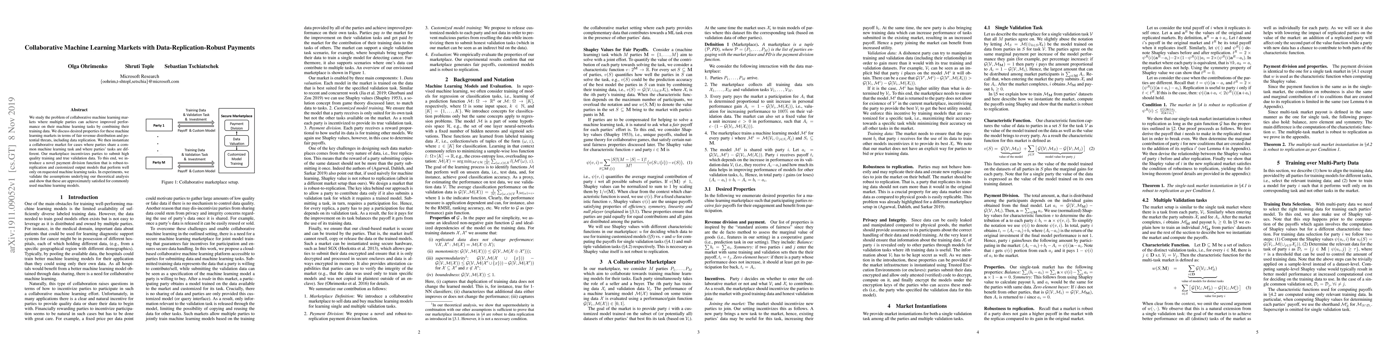 We study the problem of collaborative machine learning markets where multiple parties can achieve improved performance on their machine learning tasks by combining their training data. We discuss desired properties for these machine learning markets in terms of fair revenue distribution and potential threats, including data replication. We then instantiate a collaborative market for cases where parties share a common machine learning task and where parties' tasks are different. Our marketplace incentivizes parties to submit high quality training and true validation data. To this end, we introduce a novel payment division function that is robust-to-replication and customized output models that perform well only on requested machine learning tasks. In experiments, we validate the assumptions underlying our theoretical analysis and show that these are approximately satisfied for commonly used machine learning models.