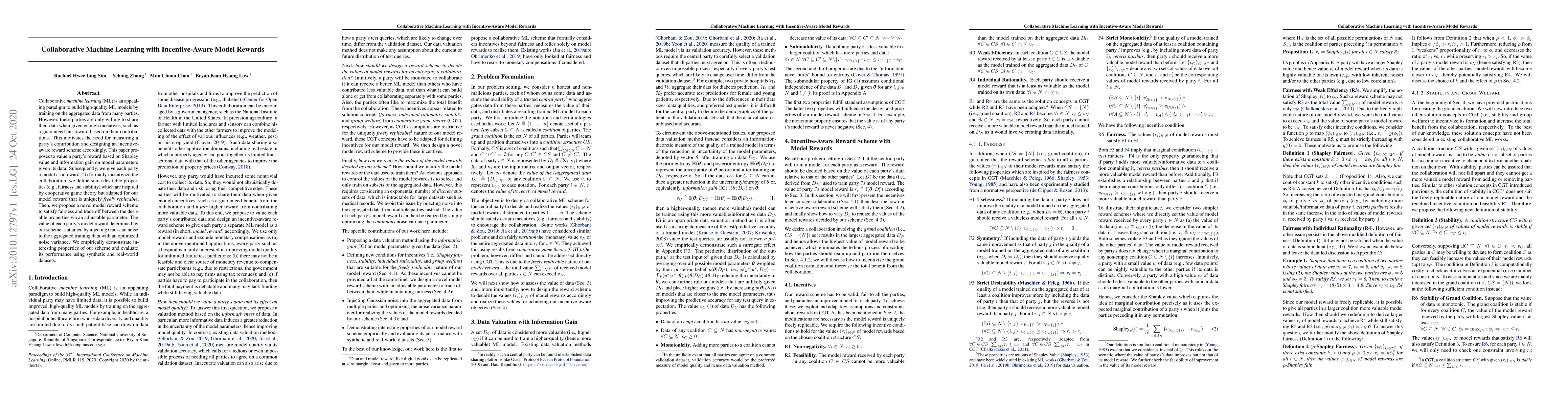 This paper proposes an incentive-aware reward scheme for collaborative machine learning, where parties are rewarded based on their contributions measured by Shapley value and information gain. The scheme aims to balance fairness and stability, using Gaussian noise to determine the value of each party's model reward, and is evaluated on both synthetic and real-world datasets.
