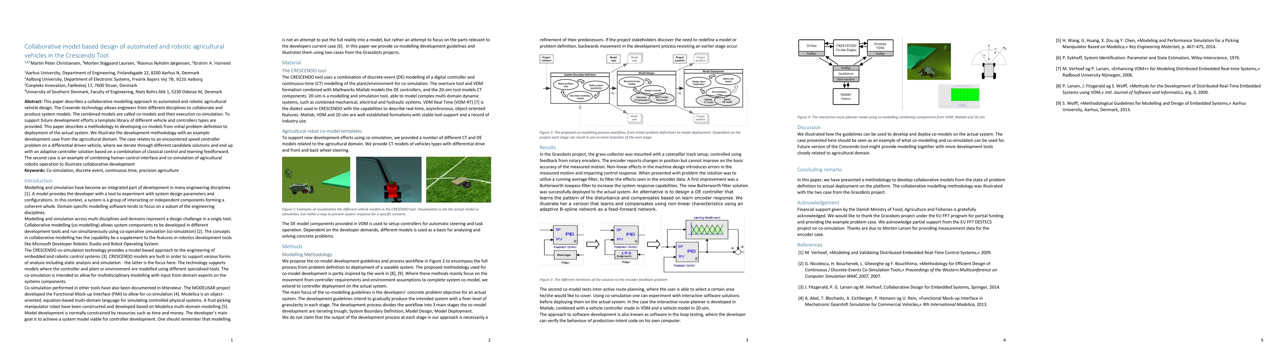 This paper describes a collaborative modelling approach to automated and robotic agricultural vehicle design. The Cresendo technology allows engineers from different disciplines to collaborate and produce system models. The combined models are called co-models and their execution co-simulation. To support future development efforts a template library of different vehicle and controllers types are provided. This paper describes a methodology to developing co-models from initial problem definition to deployment of the actual system. We illustrate the development methodology with an example development case from the agricultural domain. The case relates to an encountered speed controller problem on a differential driven vehicle, where we iterate through different candidate solutions and end up with an adaptive controller solution based on a combination of classical control and learning feedforward. The second case is an example of combining human control interface and co-simulation of agricultural robotic operation to illustrate collaborative development
