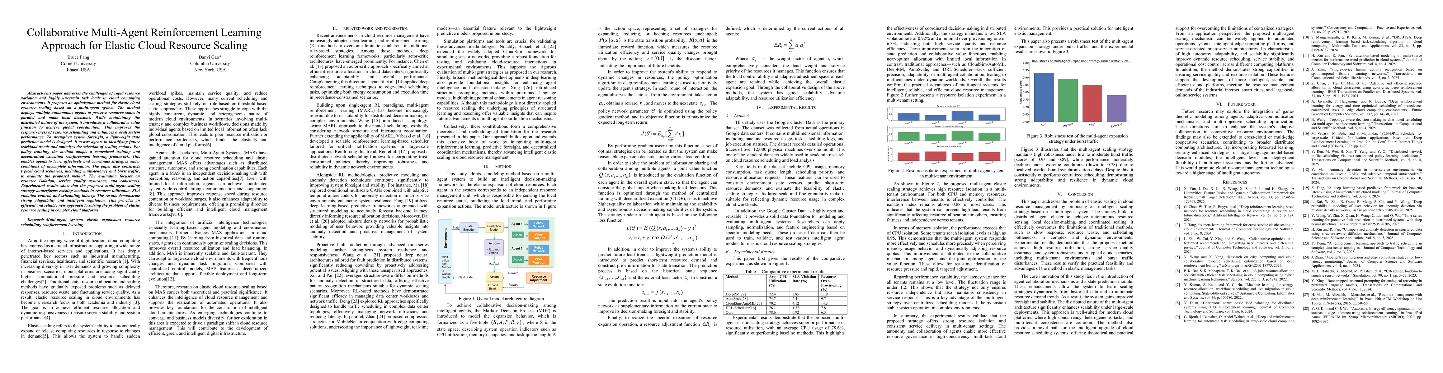 This paper addresses the challenges of rapid resource variation and highly uncertain task loads in cloud computing environments. It proposes an optimization method for elastic cloud resource scaling based on a multi-agent system. The method deploys multiple autonomous agents to perceive resource states in parallel and make local decisions. While maintaining the distributed nature of the system, it introduces a collaborative value function to achieve global coordination. This improves the responsiveness of resource scheduling and enhances overall system performance. To strengthen system foresight, a lightweight state prediction model is designed. It assists agents in identifying future workload trends and optimizes the selection of scaling actions. For policy training, the method adopts a centralized training and decentralized execution reinforcement learning framework. This enables agents to learn effectively and coordinate strategies under conditions of incomplete information. The paper also constructs typical cloud scenarios, including multi-tenancy and burst traffic, to evaluate the proposed method. The evaluation focuses on resource isolation, service quality assurance, and robustness. Experimental results show that the proposed multi-agent scaling strategy outperforms existing methods in resource utilization, SLA violation control, and scheduling latency. The results demonstrate strong adaptability and intelligent regulation. This provides an efficient and reliable new approach to solving the problem of elastic resource scaling in complex cloud platforms.
