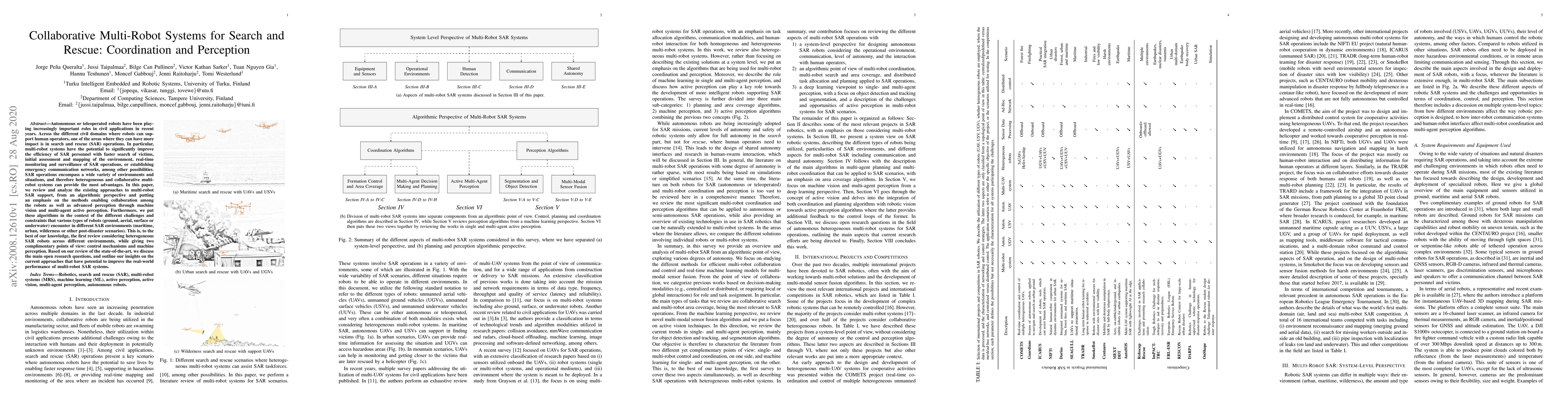 This paper reviews collaborative multi-robot systems for search and rescue, focusing on coordination and advanced perception methods. It analyzes existing algorithms for heterogeneous robots in various environments, highlighting challenges and open research questions to improve real-world performance.
