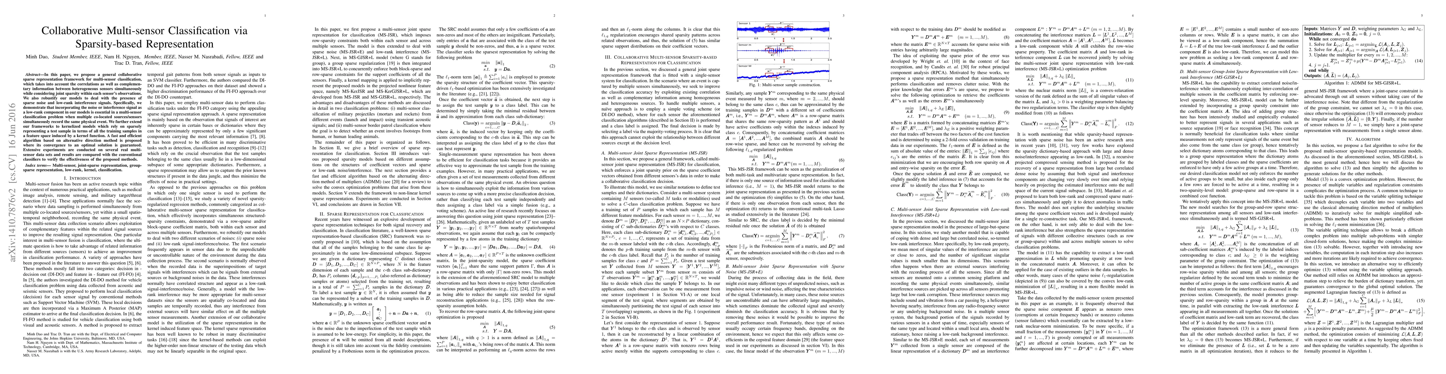 This paper introduces a collaborative sparse representation framework for multi-sensor classification that leverages correlations and complementary information from heterogeneous sensors while ensuring joint sparsity. The proposed method robustly handles noise and low-rank interference, and is extended to kernelized models for efficient classification.