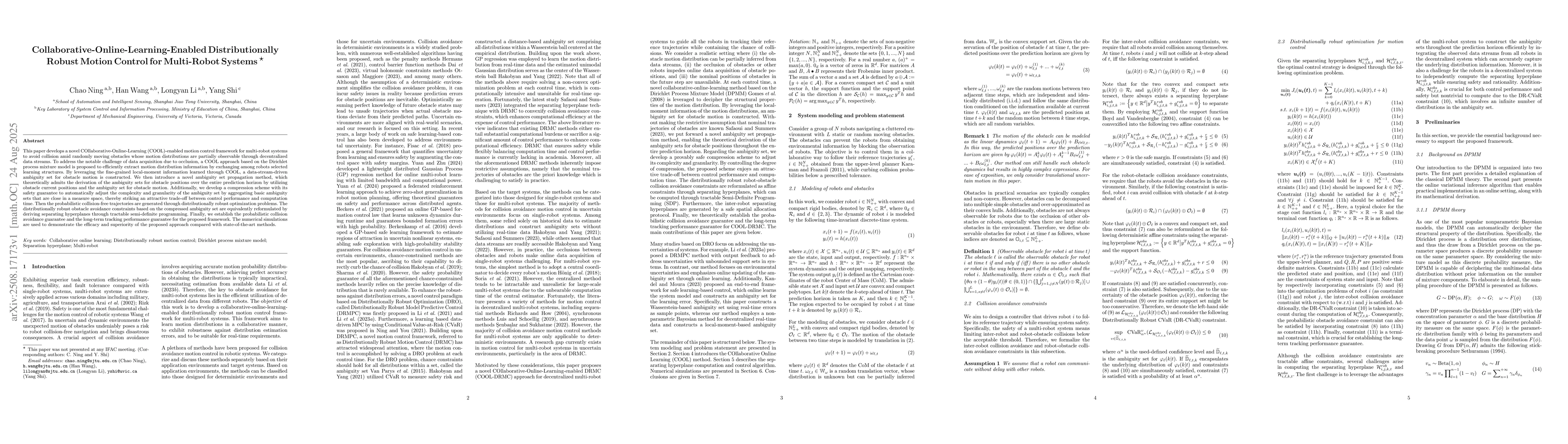 This paper develops a novel COllaborative-Online-Learning (COOL)-enabled motion control framework for multi-robot systems to avoid collision amid randomly moving obstacles whose motion distributions are partially observable through decentralized data streams. To address the notable challenge of data acquisition due to occlusion, a COOL approach based on the Dirichlet process mixture model is proposed to efficiently extract motion distribution information by exchanging among robots selected learning structures. By leveraging the fine-grained local-moment information learned through COOL, a data-stream-driven ambiguity set for obstacle motion is constructed. We then introduce a novel ambiguity set propagation method, which theoretically admits the derivation of the ambiguity sets for obstacle positions over the entire prediction horizon by utilizing obstacle current positions and the ambiguity set for obstacle motion. Additionally, we develop a compression scheme with its safety guarantee to automatically adjust the complexity and granularity of the ambiguity set by aggregating basic ambiguity sets that are close in a measure space, thereby striking an attractive trade-off between control performance and computation time. Then the probabilistic collision-free trajectories are generated through distributionally robust optimization problems. The distributionally robust obstacle avoidance constraints based on the compressed ambiguity set are equivalently reformulated by deriving separating hyperplanes through tractable semi-definite programming. Finally, we establish the probabilistic collision avoidance guarantee and the long-term tracking performance guarantee for the proposed framework. The numerical simulations are used to demonstrate the efficacy and superiority of the proposed approach compared with state-of-the-art methods.