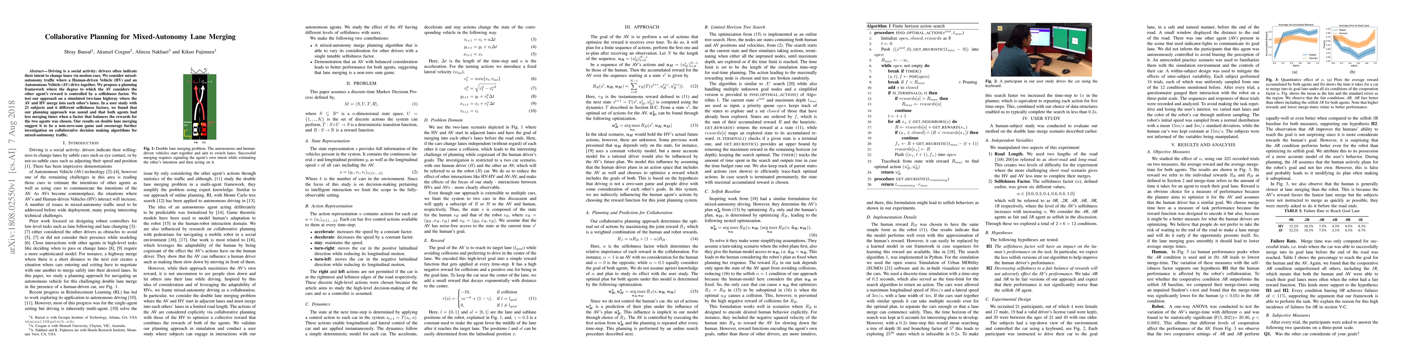 This research proposes a collaborative planning framework for mixed-autonomy lane merging, where an Autonomous Vehicle considers the Human-driven Vehicle's intent through a selfishness factor. Results from a simulated environment and user study indicate that balanced reward consideration reduces merging times, suggesting collaborative decision-making in mixed-autonomy traffic.