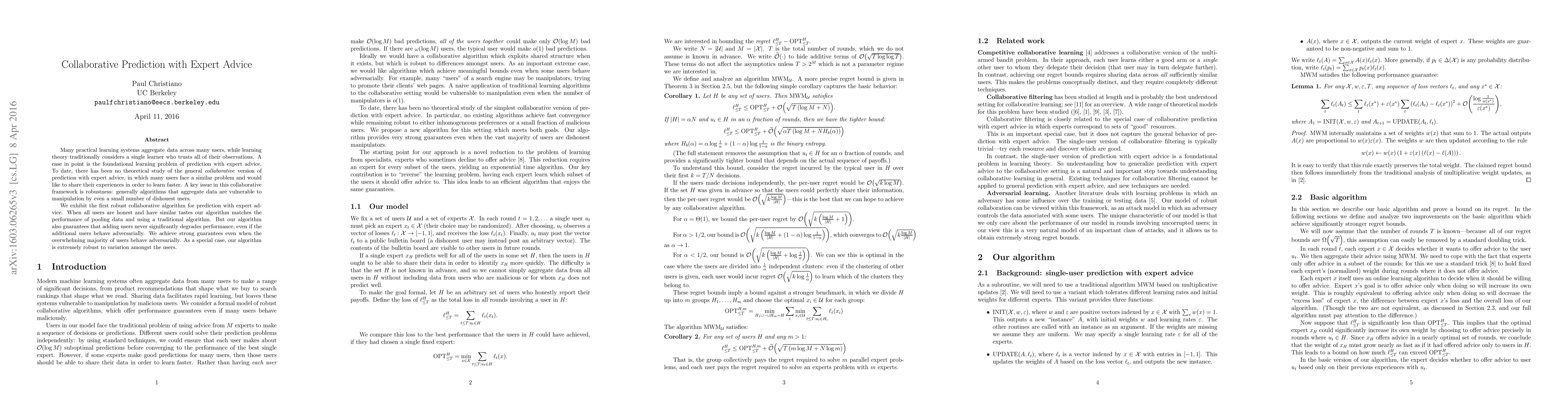 This paper introduces the first robust collaborative algorithm for prediction with expert advice, demonstrating strong performance when users are honest and ensuring minimal performance degradation even when additional adversarial users are added. The algorithm guarantees effective learning despite potential manipulation by a minority of users.