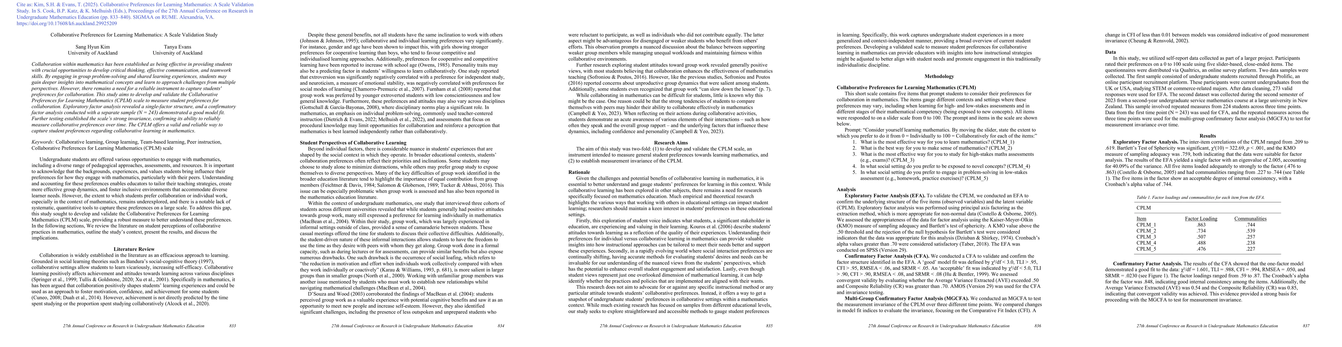 Collaboration within mathematics has been established as being effective in providing students with crucial opportunities to develop critical thinking, effective communication, and teamwork skills. By engaging in group problem-solving and shared learning experiences, students may gain deeper insights into mathematical concepts and learn to approach challenges from multiple perspectives. However, there remains a need for a reliable instrument to capture students' preferences for collaboration. This study aims to develop and validate the Collaborative Preferences for Learning Mathematics (CPLM) scale to measure student preferences for collaboration. Exploratory factor analysis revealed a single-factor structure, and a confirmatory factor analysis conducted with a separate sample (N = 243) demonstrated a good model fit. Further testing established the scale's strong invariance, confirming its ability to reliably measure collaborative preferences over time. The CPLM offers a valid and reliable way to capture student preferences regarding collaborative learning in mathematics.