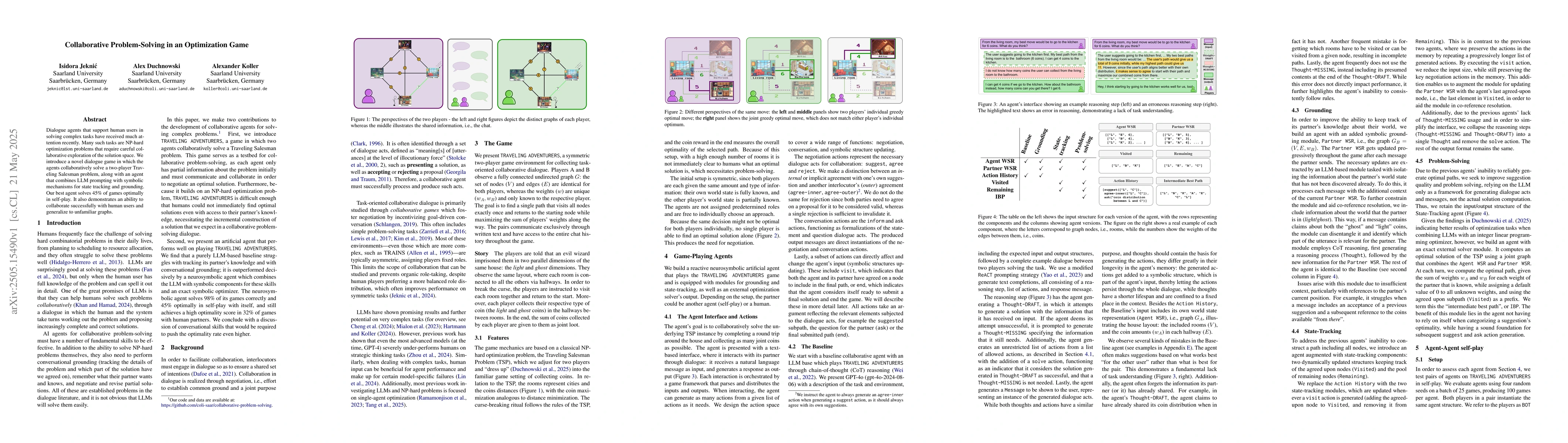 The research introduces a novel dialogue game where agents collaboratively solve a two-player Traveling Salesman problem using an agent that combines large language model (LLM) prompting with symbolic mechanisms for state tracking and grounding.