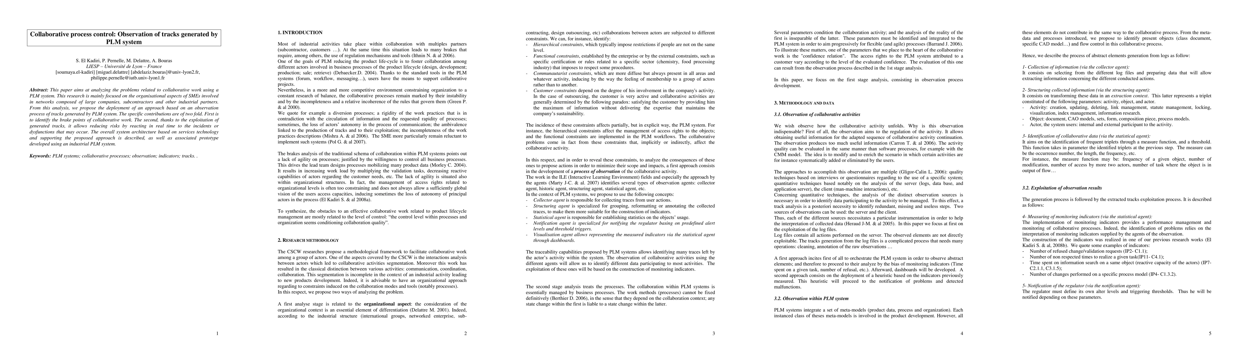 This paper aims at analyzing the problems related to collaborative work using a PLM system. This research is mainly focused on the organisational aspects of SMEs involved in networks composed of large companies, subcontractors and other industrial partners. From this analysis, we propose the deployment of an approach based on an observation process of tracks generated by PLM system. The specific contributions are of two fold. First is to identify the brake points of collaborative work. The second, thanks to the exploitation of generated tracks, it allows reducing risks by reacting in real time to the incidents or dysfunctions that may occur. The overall system architecture based on services technology and supporting the proposed approach is described, as well as associated prototype developed using an industrial PLM system.