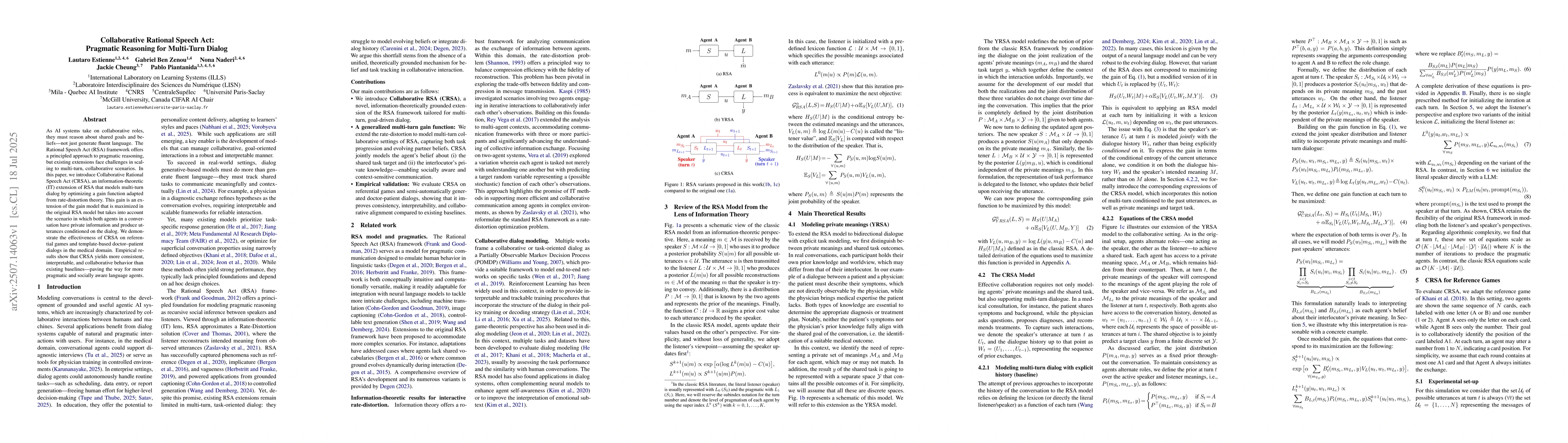 As AI systems take on collaborative roles, they must reason about shared goals and beliefs-not just generate fluent language. The Rational Speech Act (RSA) framework offers a principled approach to pragmatic reasoning, but existing extensions face challenges in scaling to multi-turn, collaborative scenarios. In this paper, we introduce Collaborative Rational Speech Act (CRSA), an information-theoretic (IT) extension of RSA that models multi-turn dialog by optimizing a gain function adapted from rate-distortion theory. This gain is an extension of the gain model that is maximized in the original RSA model but takes into account the scenario in which both agents in a conversation have private information and produce utterances conditioned on the dialog. We demonstrate the effectiveness of CRSA on referential games and template-based doctor-patient dialogs in the medical domain. Empirical results show that CRSA yields more consistent, interpretable, and collaborative behavior than existing baselines-paving the way for more pragmatic and socially aware language agents.