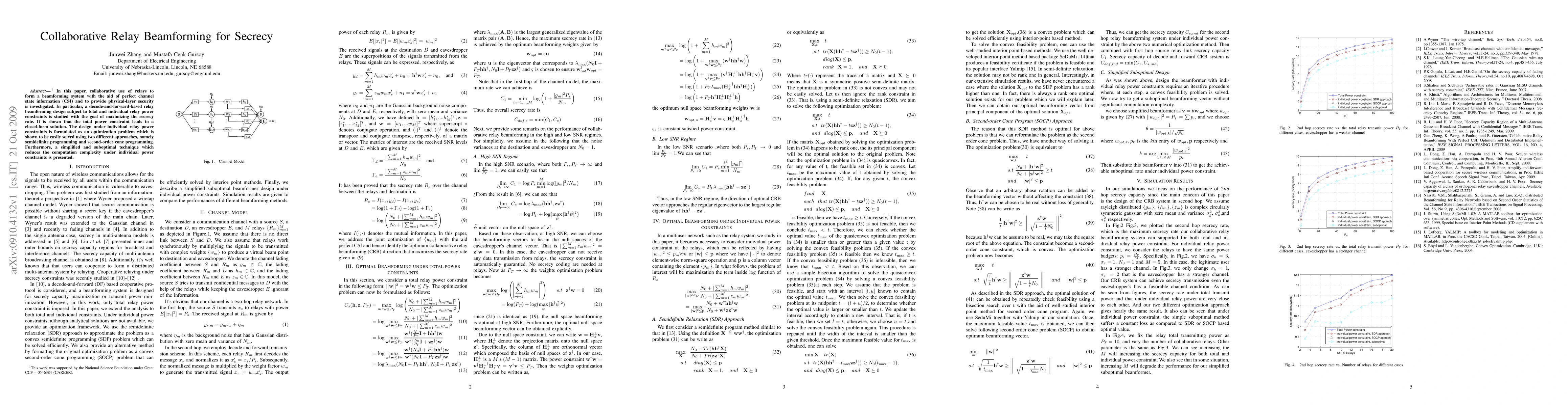 This paper investigates collaborative relay beamforming to enhance physical-layer security using perfect channel state information. It maximizes secrecy rate under total and individual relay power constraints, providing closed-form solutions for the former and optimization approaches for the latter, including semidefinite and second-order cone programming, along with a simplified suboptimal method.