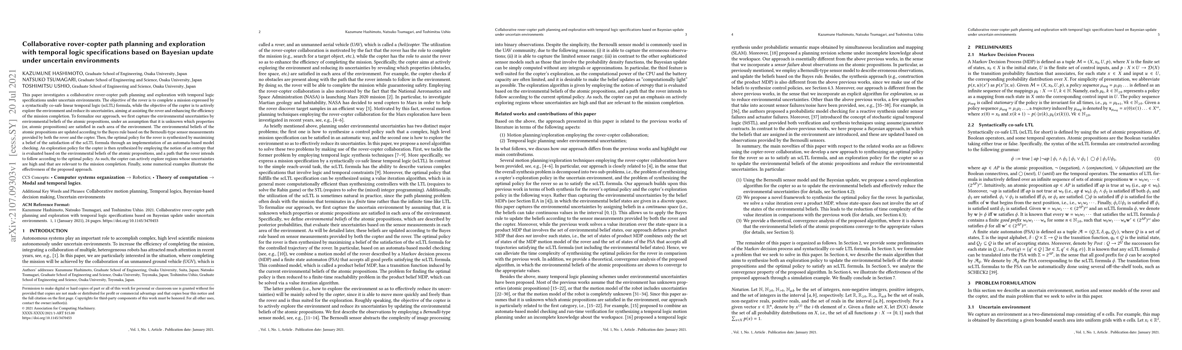 This paper proposes a collaborative rover-copter path planning method using temporal logic specifications under uncertain environments, where the copter explores to reduce uncertainties and assist the rover in mission completion. The environmental uncertainties are updated via Bayesian inference, and optimal policies are synthesized using automata-based model checking and entropy-based exploration strategies.