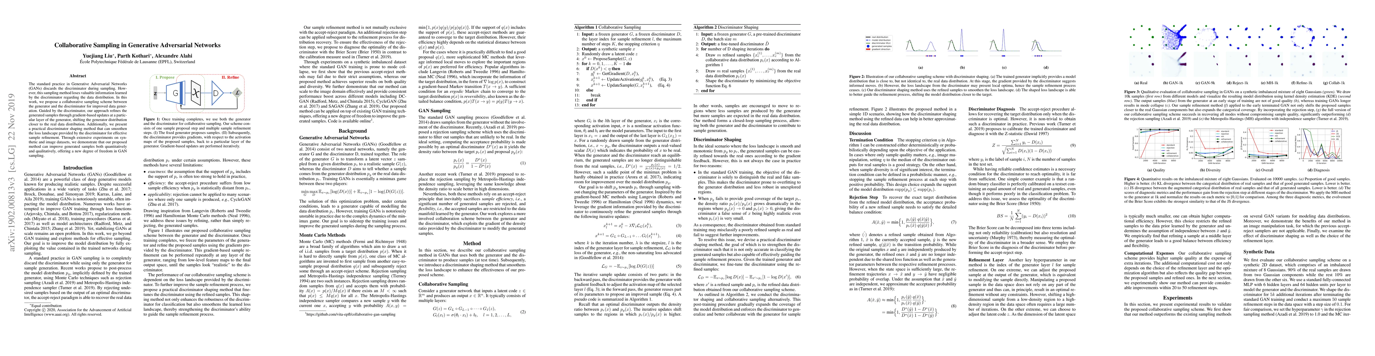 This paper proposes a collaborative sampling scheme in GANs that leverages the discriminator to refine generated samples through gradient-based updates, improving both quantitative and qualitative sample quality. The method also introduces a discriminator shaping technique to smooth the loss landscape for better sample refinement.