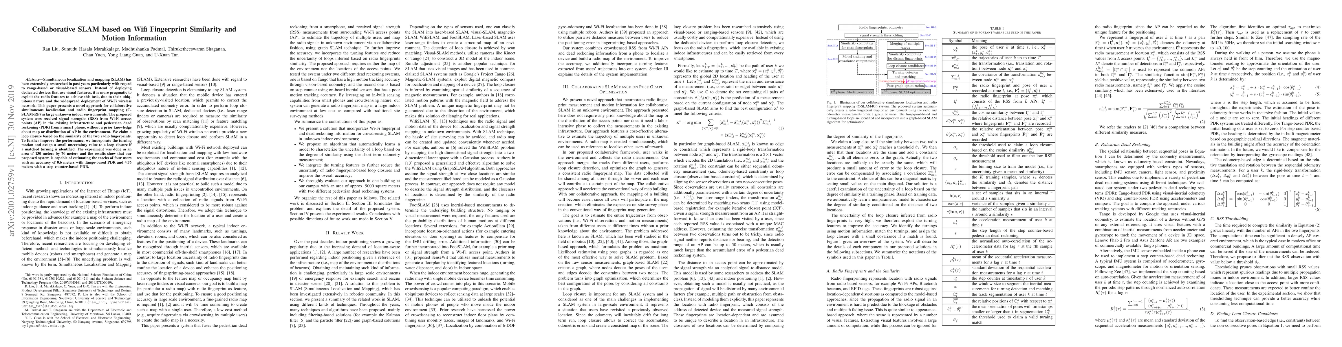 This paper presents a collaborative SLAM system (C-SLAM-RF) using Wi-Fi fingerprint similarity and motion information for mapping large unknown indoor environments. The method leverages RSS from Wi-Fi access points and pedestrian dead reckoning from smartphones, achieving accurate track estimations with an error of 0.6 meters using Tango-based PDR and 4.76 meters with step counter-based PDR.