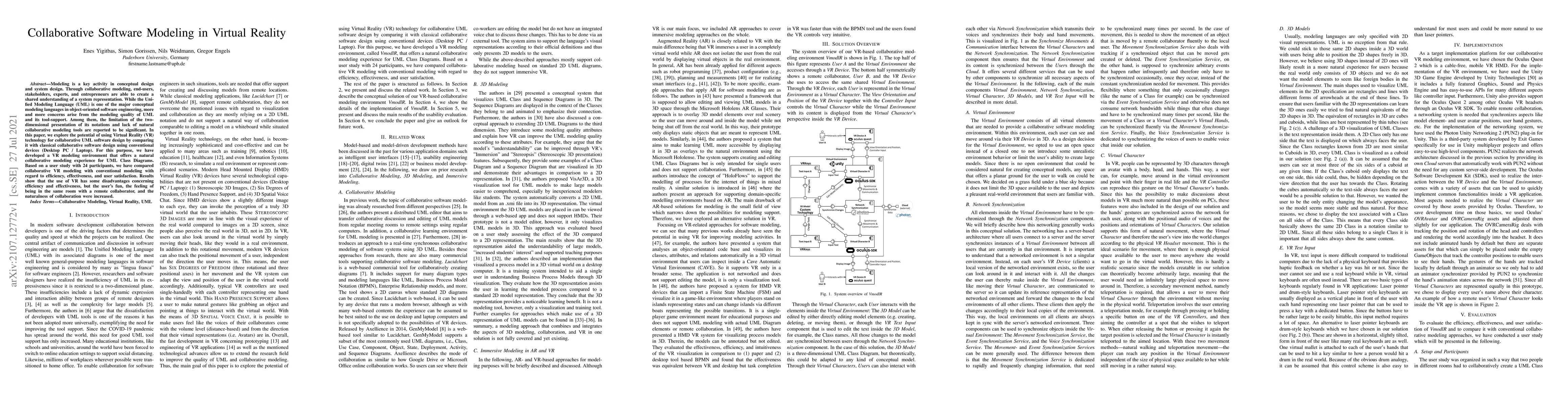 This paper investigates the use of Virtual Reality (VR) for collaborative Unified Modeling Language (UML) software design, finding that while VR enhances user satisfaction and collaboration experience, it has drawbacks in efficiency and effectiveness compared to traditional desktop modeling.