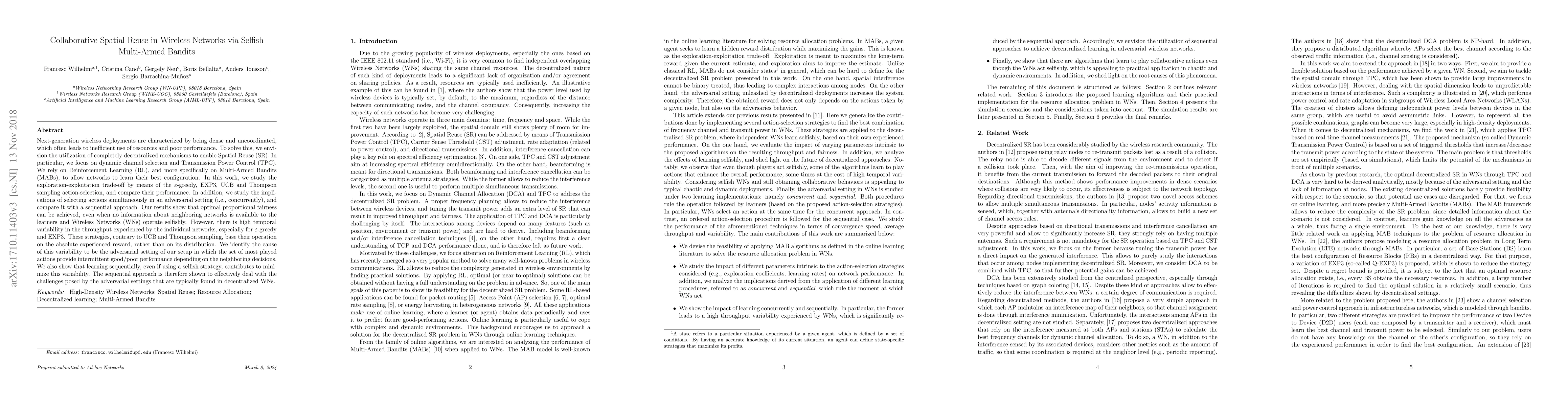 This paper explores decentralized mechanisms for spatial reuse in dense wireless networks using reinforcement learning and Multi-Armed Bandits. It compares various action-selection strategies and finds that sequential learning, even with selfish behavior, minimizes throughput variability in adversarial settings.