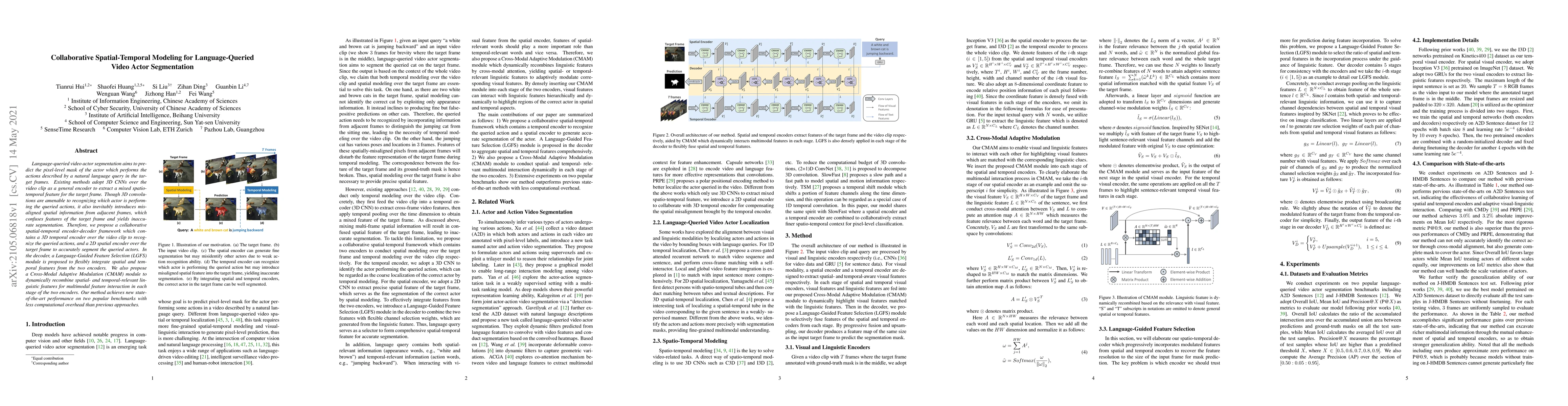 This paper proposes a collaborative spatial-temporal encoder-decoder framework for language-queried video actor segmentation, integrating a 3D temporal encoder and a 2D spatial encoder to improve segmentation accuracy. It employs a Language-Guided Feature Selection and Cross-Modal Adaptive Modulation for optimal feature integration.