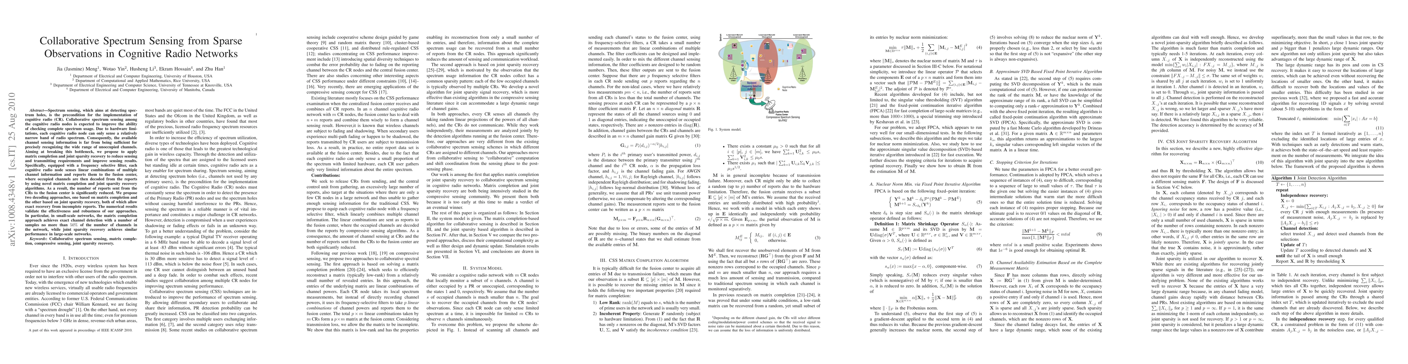 This paper proposes collaborative spectrum sensing techniques using matrix completion and joint sparsity recovery to enhance cognitive radio networks. By leveraging sparse observations, the approach reduces reporting requirements and improves spectrum detection, achieving exact channel detection with significantly fewer samples.