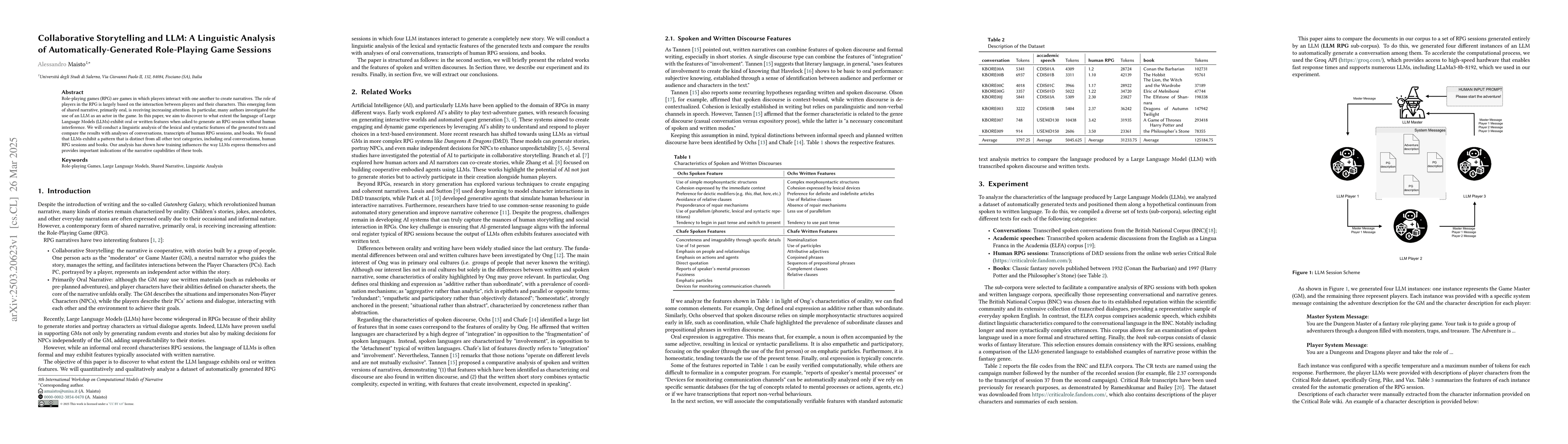 The study conducted a linguistic analysis of automatically-generated RPG sessions by LLMs, comparing their language features with human RPG sessions, oral conversations, and books.