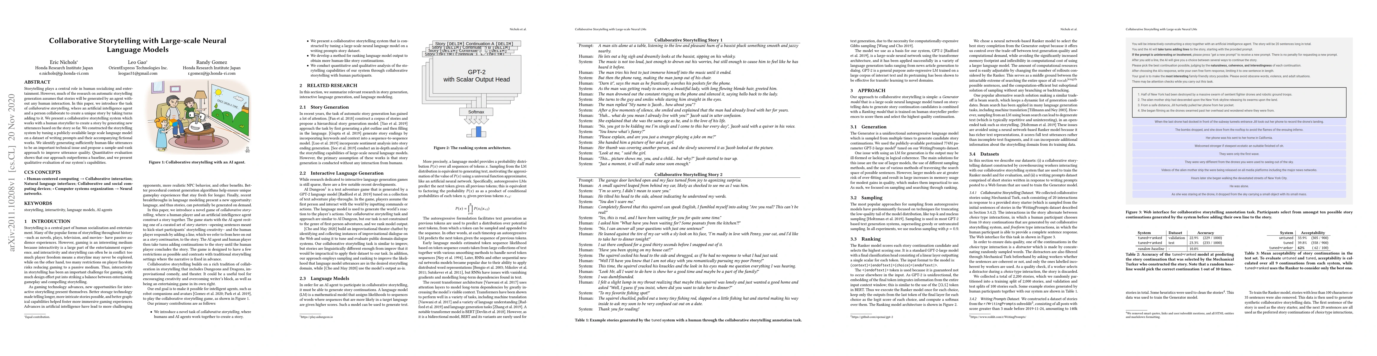 This paper explores collaborative storytelling between humans and large-scale neural language models, introducing a system that tunes a language model to generate human-like story utterances in a turn-based format. The authors propose a sample-and-rank approach to enhance the quality of generated text, demonstrating improved performance over a baseline through both quantitative and qualitative evaluations.