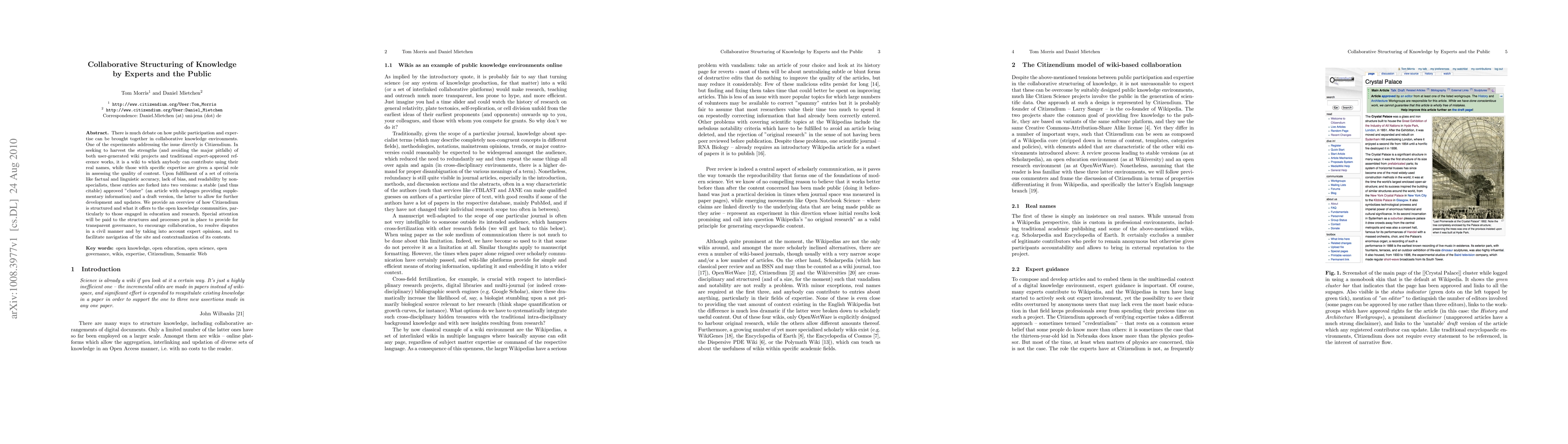 There is much debate on how public participation and expertise can be brought together in collaborative knowledge environments. One of the experiments addressing the issue directly is Citizendium. In seeking to harvest the strengths (and avoiding the major pitfalls) of both user-generated wiki projects and traditional expert-approved reference works, it is a wiki to which anybody can contribute using their real names, while those with specific expertise are given a special role in assessing the quality of content. Upon fulfillment of a set of criteria like factual and linguistic accuracy, lack of bias, and readability by non-specialists, these entries are forked into two versions: a stable (and thus citable) approved "cluster" (an article with subpages providing supplementary information) and a draft version, the latter to allow for further development and updates. We provide an overview of how Citizendium is structured and what it offers to the open knowledge communities, particularly to those engaged in education and research. Special attention will be paid to the structures and processes put in place to provide for transparent governance, to encourage collaboration, to resolve disputes in a civil manner and by taking into account expert opinions, and to facilitate navigation of the site and contextualization of its contents.