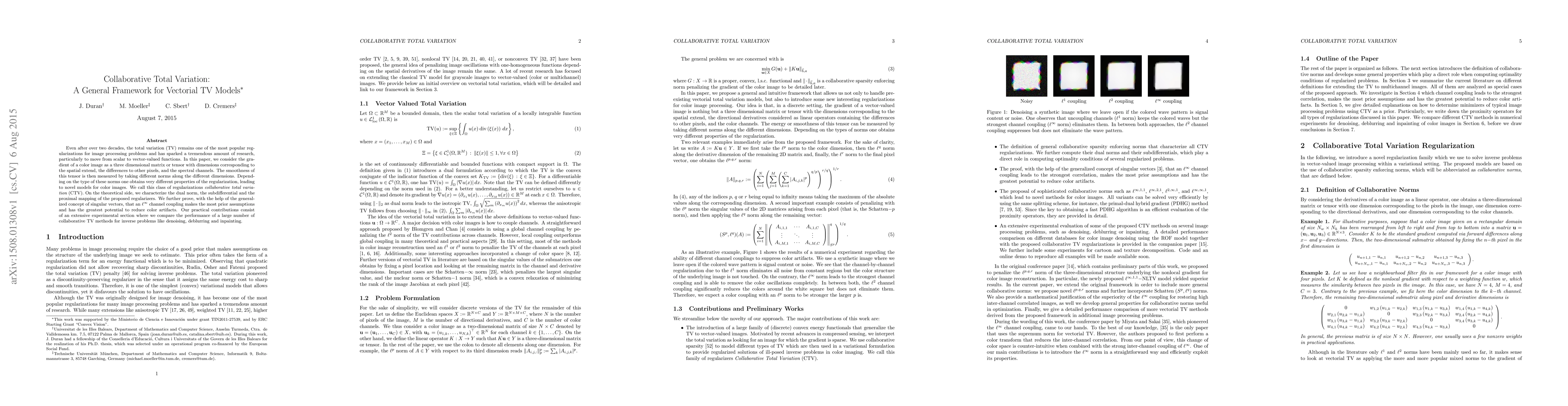 Researchers introduce Collaborative Total Variation (CTV), a new framework for regularizing vector-valued functions in image processing, offering improved performance in denoising, deblurring, and inpainting tasks.
