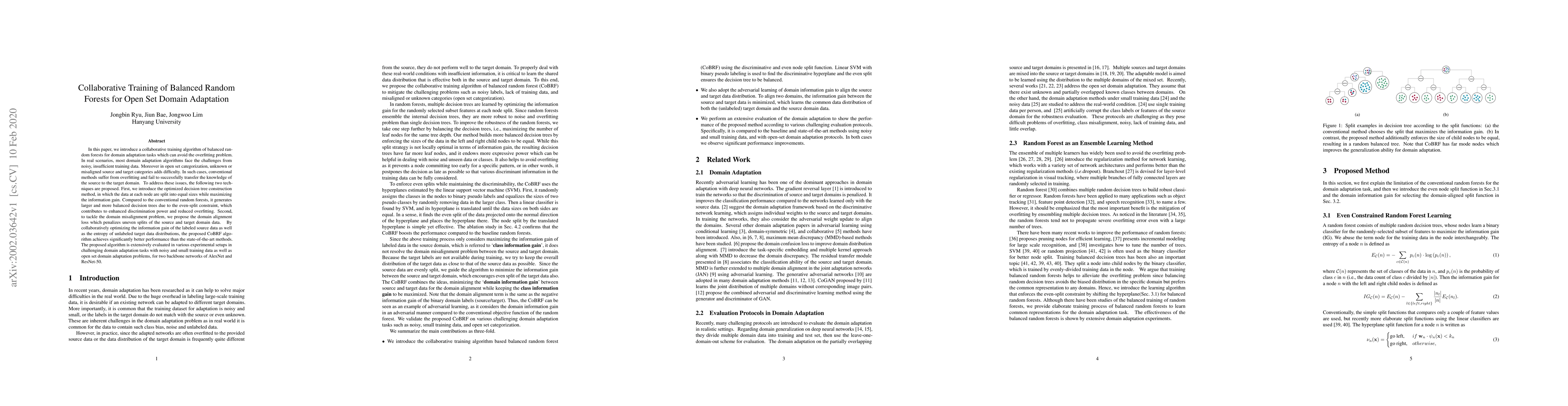In this paper, we introduce a collaborative training algorithm of balanced random forests with convolutional neural networks for domain adaptation tasks. In real scenarios, most domain adaptation algorithms face the challenges from noisy, insufficient training data and open set categorization. In such cases, conventional methods suffer from overfitting and fail to successfully transfer the knowledge of the source to the target domain. To address these issues, the following two techniques are proposed. First, we introduce the optimized decision tree construction method with convolutional neural networks, in which the data at each node are split into equal sizes while maximizing the information gain. It generates balanced decision trees on deep features because of the even-split constraint, which contributes to enhanced discrimination power and reduced overfitting problem. Second, to tackle the domain misalignment problem, we propose the domain alignment loss which penalizes uneven splits of the source and target domain data. By collaboratively optimizing the information gain of the labeled source data as well as the entropy of unlabeled target data distributions, the proposed CoBRF algorithm achieves significantly better performance than the state-of-the-art methods.