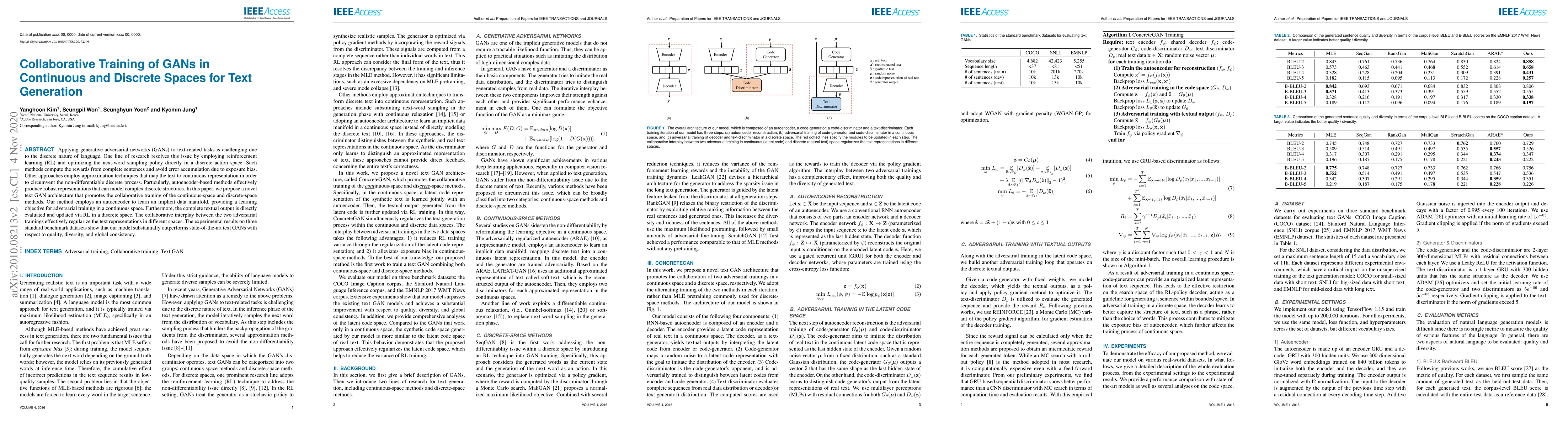 This paper proposes a novel GAN architecture that integrates continuous-space and discrete-space training methods for text generation, using an autoencoder for continuous representation and reinforcement learning for discrete space updates, achieving superior performance on benchmark datasets.