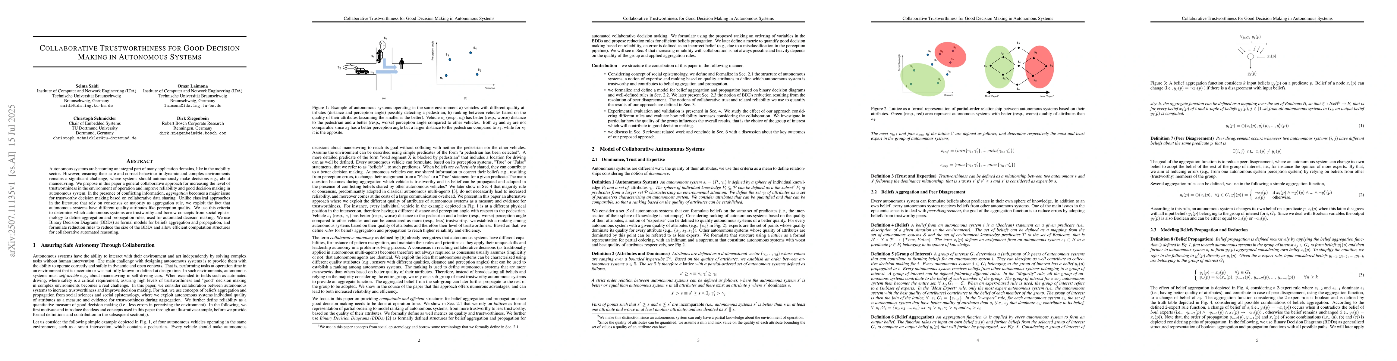 Autonomous systems are becoming an integral part of many application domains, like in the mobility sector. However, ensuring their safe and correct behaviour in dynamic and complex environments remains a significant challenge, where systems should autonomously make decisions e.g., about manoeuvring. We propose in this paper a general collaborative approach for increasing the level of trustworthiness in the environment of operation and improve reliability and good decision making in autonomous system. In the presence of conflicting information, aggregation becomes a major issue for trustworthy decision making based on collaborative data sharing. Unlike classical approaches in the literature that rely on consensus or majority as aggregation rule, we exploit the fact that autonomous systems have different quality attributes like perception quality. We use this criteria to determine which autonomous systems are trustworthy and borrow concepts from social epistemology to define aggregation and propagation rules, used for automated decision making. We use Binary Decision Diagrams (BDDs) as formal models for beliefs aggregation and propagation, and formulate reduction rules to reduce the size of the BDDs and allow efficient computation structures for collaborative automated reasoning.