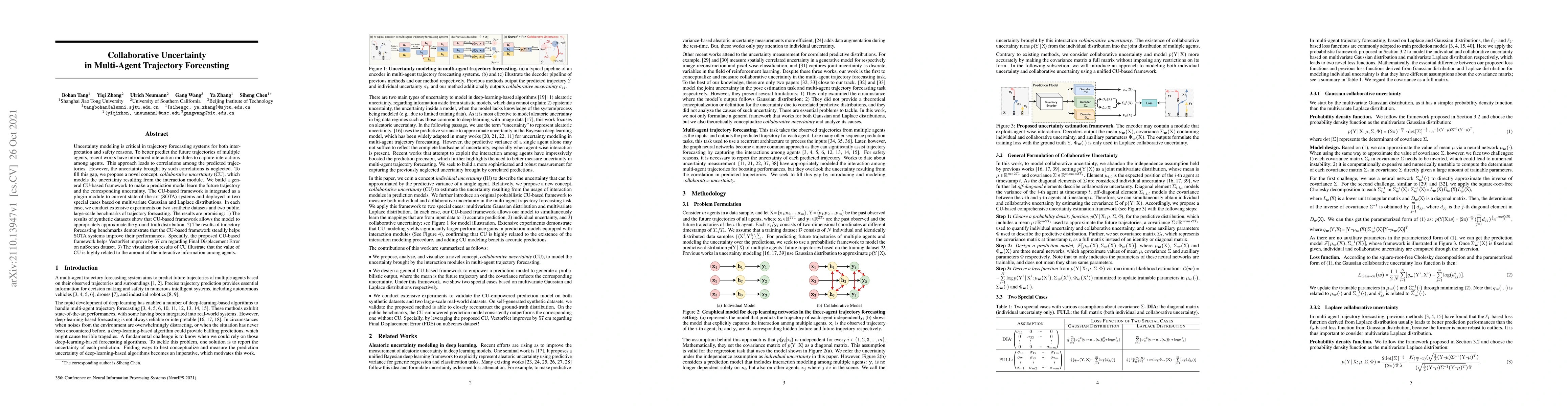 Uncertainty modeling is critical in trajectory forecasting systems for both interpretation and safety reasons. To better predict the future trajectories of multiple agents, recent works have introduced interaction modules to capture interactions among agents. This approach leads to correlations among the predicted trajectories. However, the uncertainty brought by such correlations is neglected. To fill this gap, we propose a novel concept, collaborative uncertainty(CU), which models the uncertainty resulting from the interaction module. We build a general CU-based framework to make a prediction model to learn the future trajectory and the corresponding uncertainty. The CU-based framework is integrated as a plugin module to current state-of-the-art (SOTA) systems and deployed in two special cases based on multivariate Gaussian and Laplace distributions. In each case, we conduct extensive experiments on two synthetic datasets and two public, large-scale benchmarks of trajectory forecasting. The results are promising: 1) The results of synthetic datasets show that CU-based framework allows the model to appropriately approximate the ground-truth distribution. 2) The results of trajectory forecasting benchmarks demonstrate that the CU-based framework steadily helps SOTA systems improve their performances. Especially, the proposed CU-based framework helps VectorNet improve by 57cm regarding Final Displacement Error on nuScenes dataset. 3) The visualization results of CU illustrate that the value of CU is highly related to the amount of the interactive information among agents.