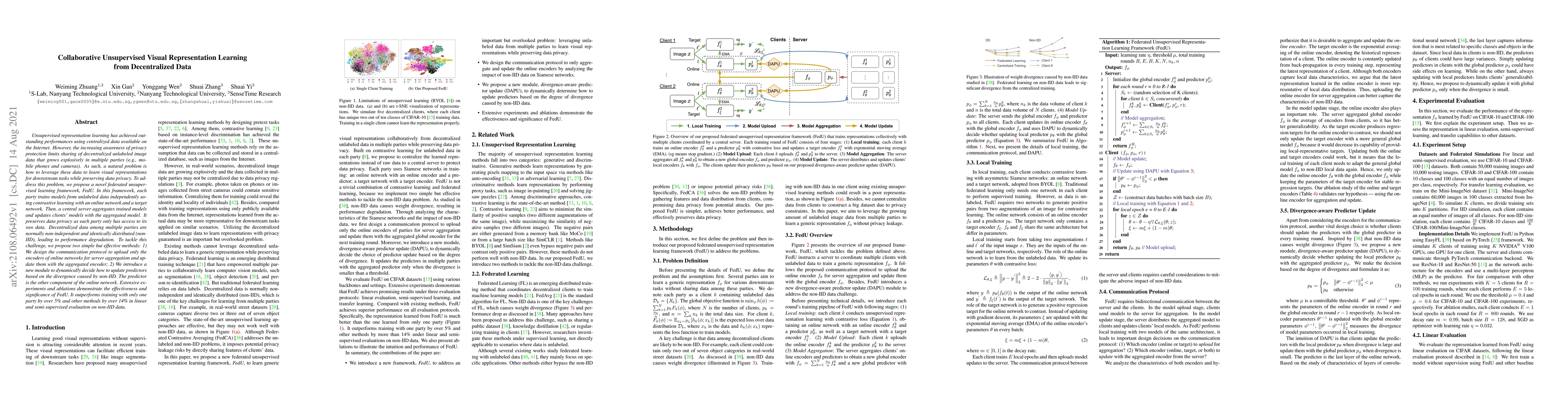 This paper presents a federated unsupervised learning framework, FedU, to collaboratively learn visual representations from decentralized, unlabeled data while preserving privacy. FedU employs contrastive learning and introduces methods to handle non-IID data, achieving superior performance over single-party training and other methods.