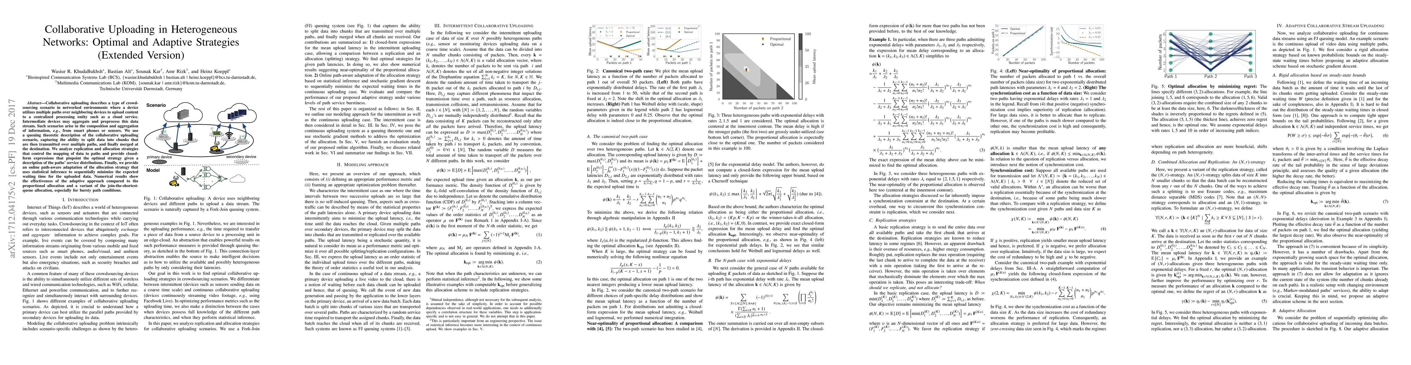 Collaborative uploading describes a type of crowdsourcing scenario in networked environments where a device utilizes multiple paths over neighboring devices to upload content to a centralized processing entity such as a cloud service. Intermediate devices may aggregate and preprocess this data stream. Such scenarios arise in the composition and aggregation of information, e.g., from smartphones or sensors. We use a queuing theoretic description of the collaborative uploading scenario, capturing the ability to split data into chunks that are then transmitted over multiple paths, and finally merged at the destination. We analyze replication and allocation strategies that control the mapping of data to paths and provide closed-form expressions that pinpoint the optimal strategy given a description of the paths' service distributions. Finally, we provide an online path-aware adaptation of the allocation strategy that uses statistical inference to sequentially minimize the expected waiting time for the uploaded data. Numerical results show the effectiveness of the adaptive approach compared to the proportional allocation and a variant of the join-the-shortest-queue allocation, especially for bursty path conditions.