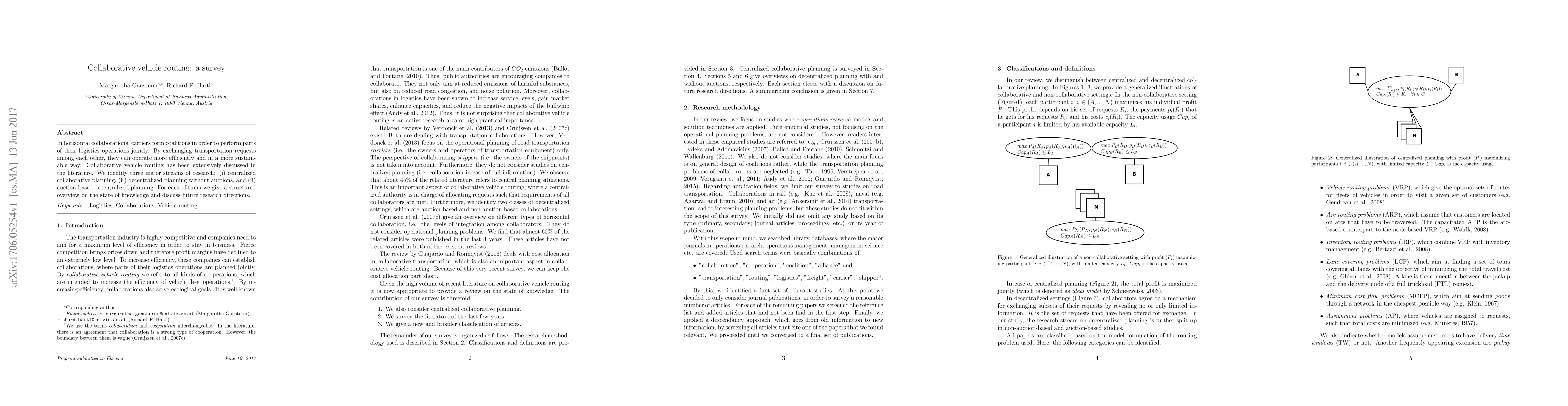 This paper surveys collaborative vehicle routing in logistics, identifying three main research streams: centralized planning, decentralized planning without auctions, and auction-based decentralized planning. It provides an overview of current knowledge and suggests future research directions.